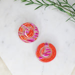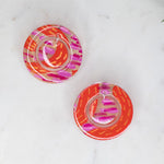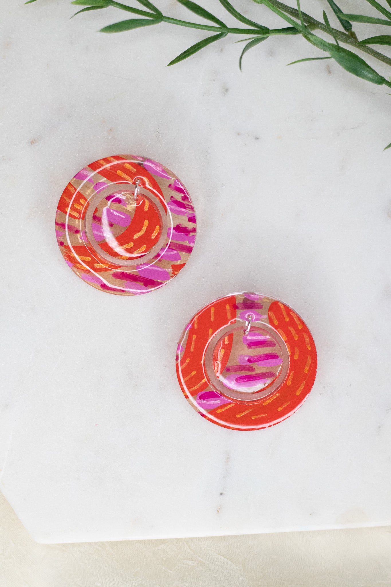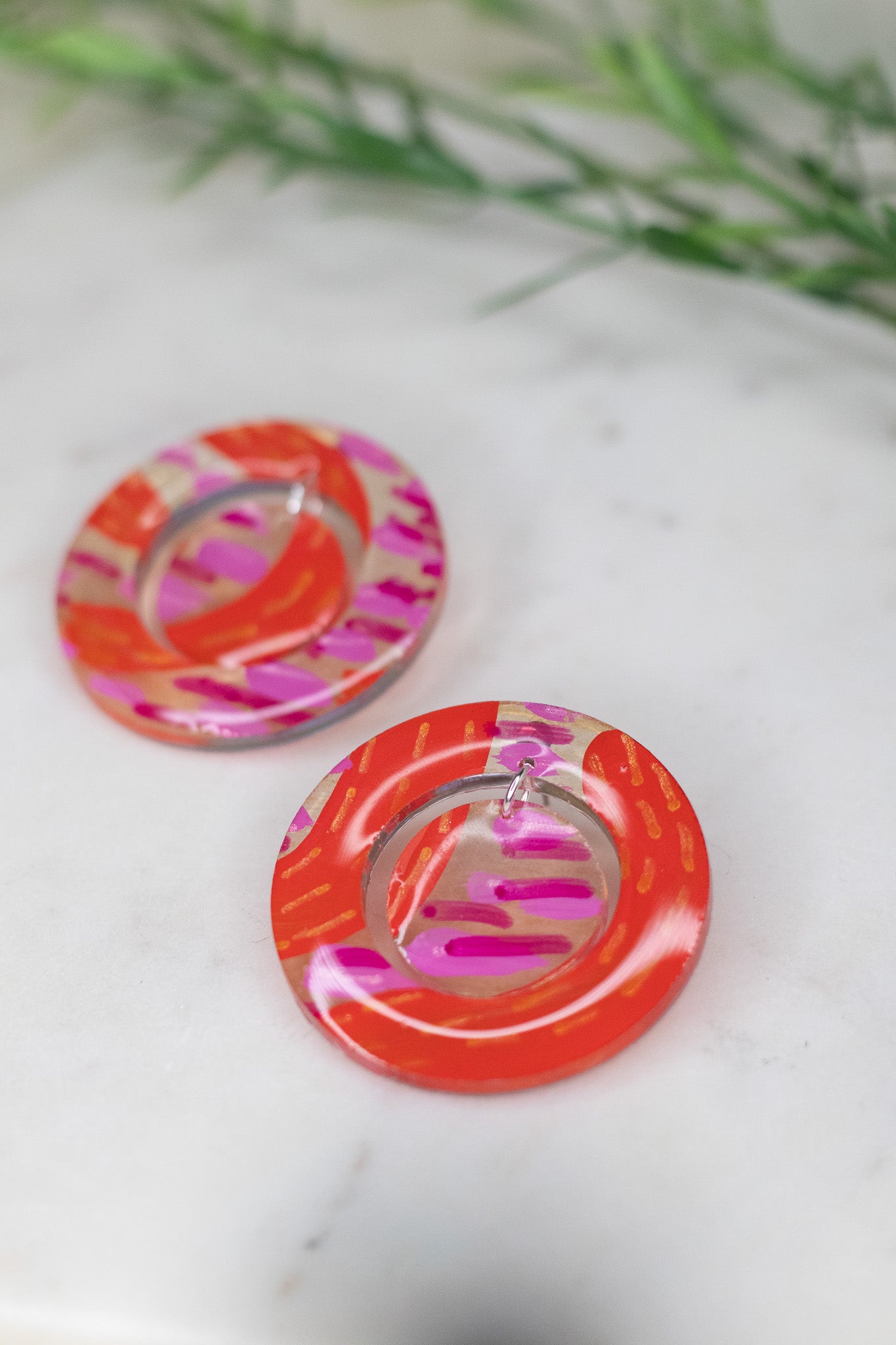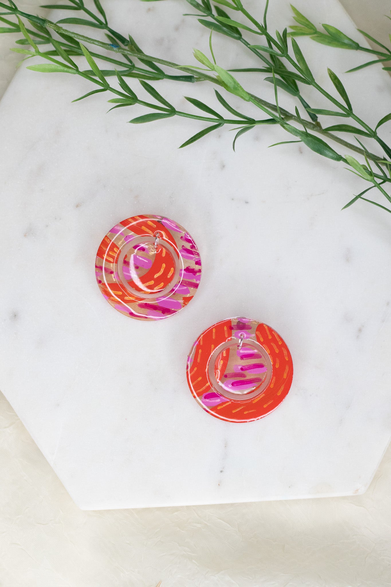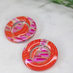 Vibrant and full of movement. This layered acrylic hoop design captures the warm hues of a painted sky—hot pink, cherry red, and glimmering coral. Abstract strokes make each pair unique and totally energizing.