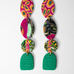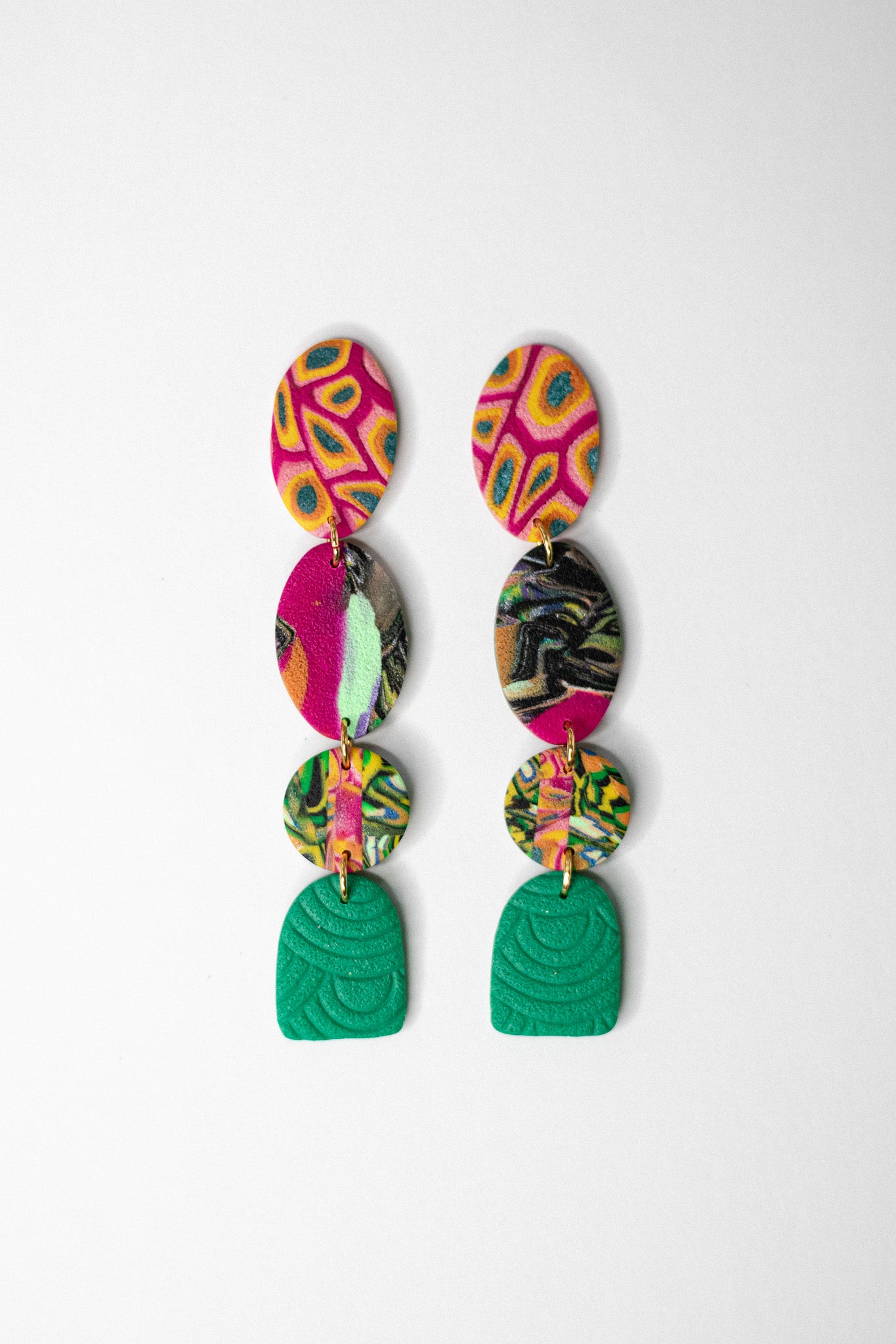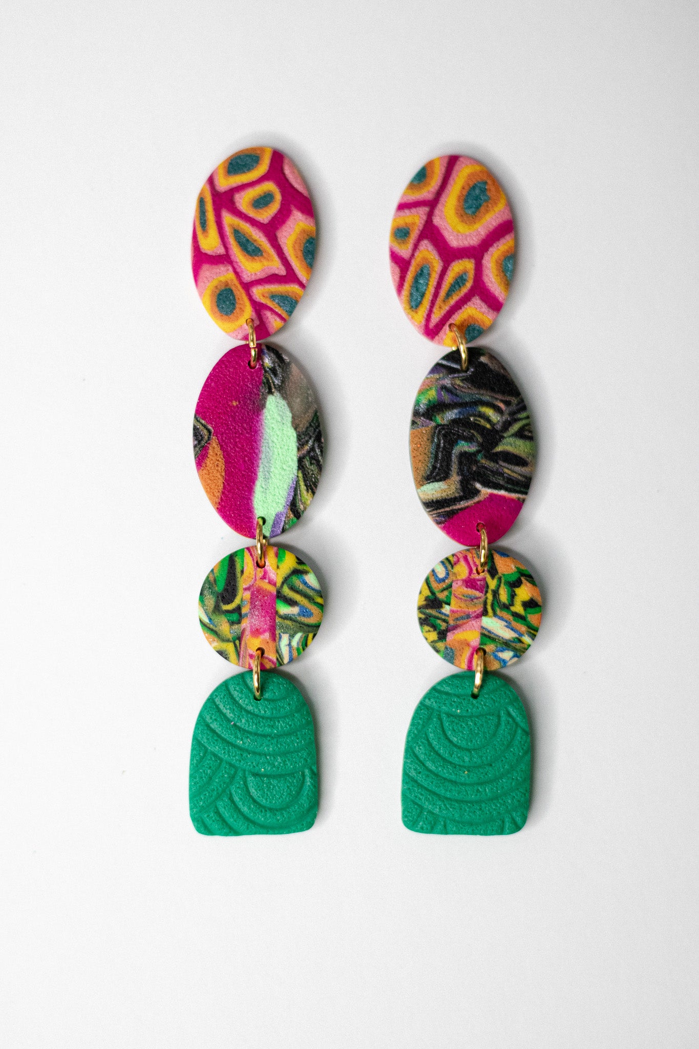 These elegant drop earrings capture the spirited vibe of a road trip playlist in a wearable form. Featuring layered polymer clay with vivid prints, they complement a variety of styles effortlessly. Designed to be lightweight and dynamic, they bring graceful movement to any ensemble.