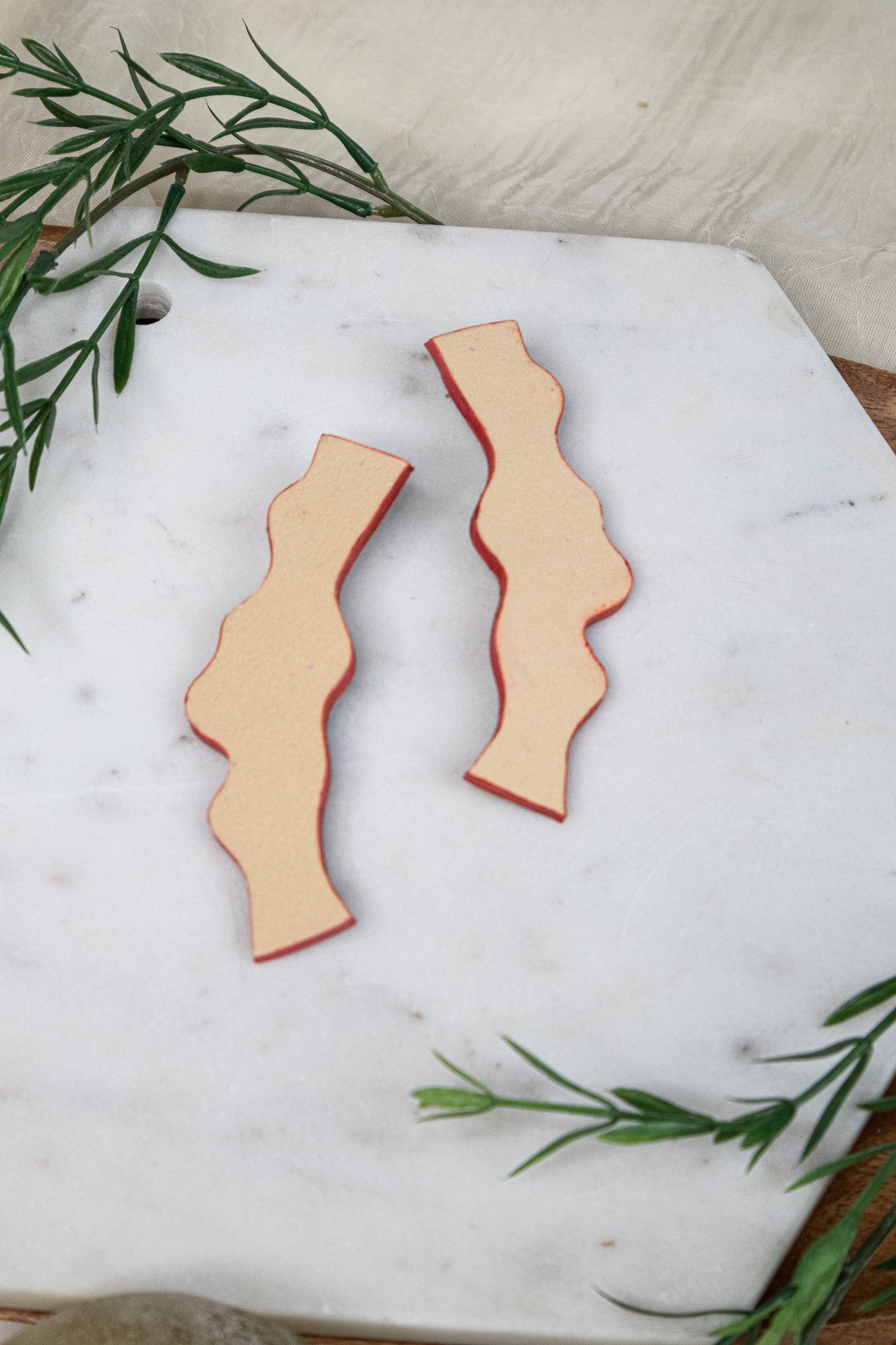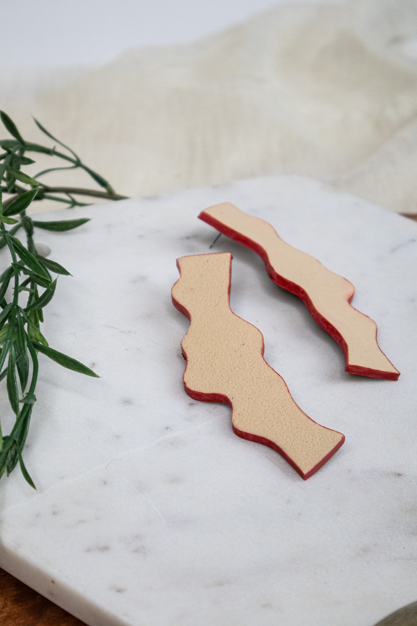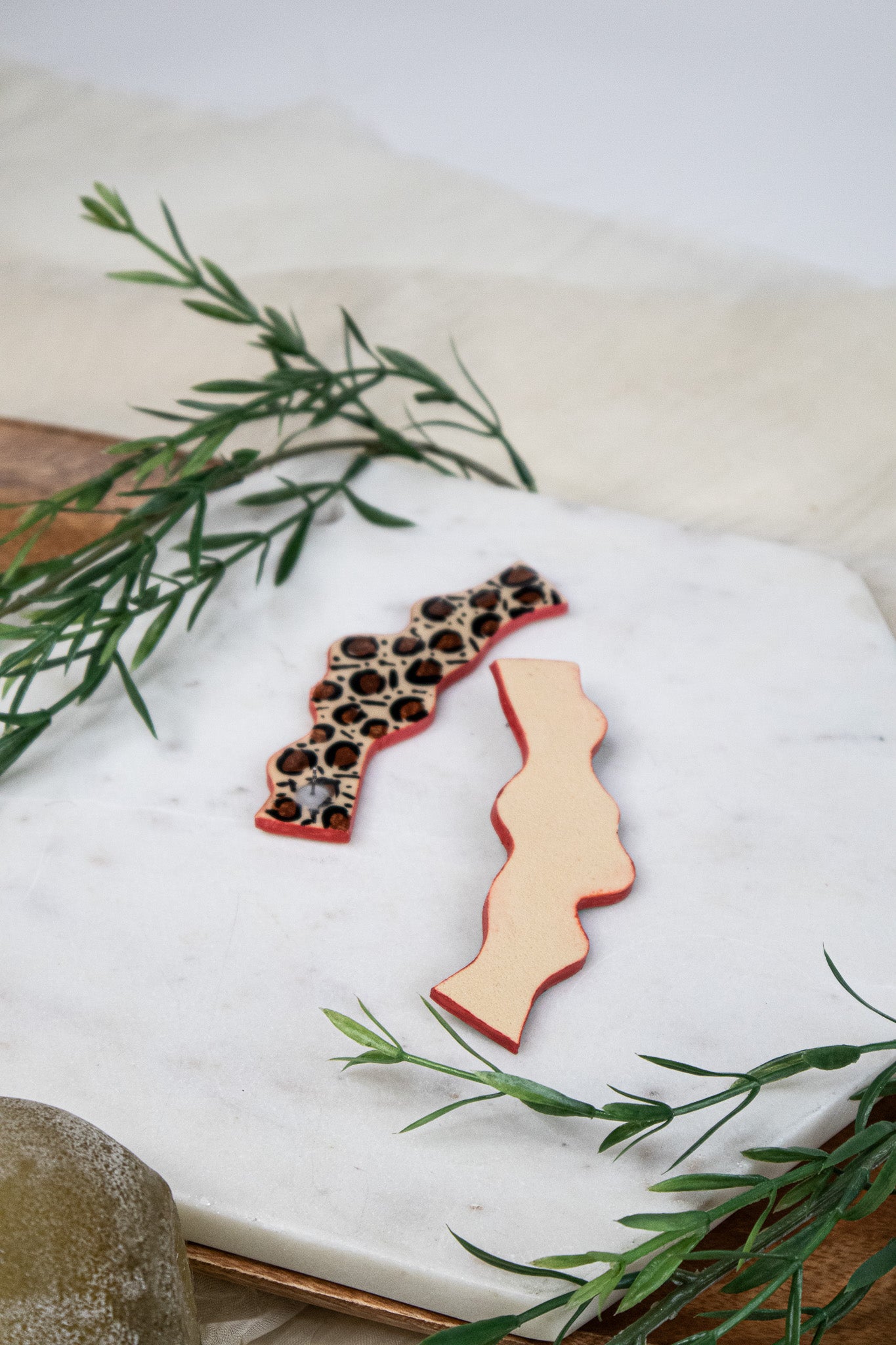 Crafted from textured clay with stainless steel posts, these earrings are ultra-light for all-day wear and big style without the pull. Neutral from the front, wild from behind. These Wiggles feature a creamy tan front with a soft matte texture, paired with a bold leopard print back for a hidden pop of attitude.