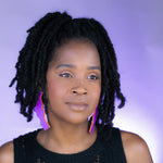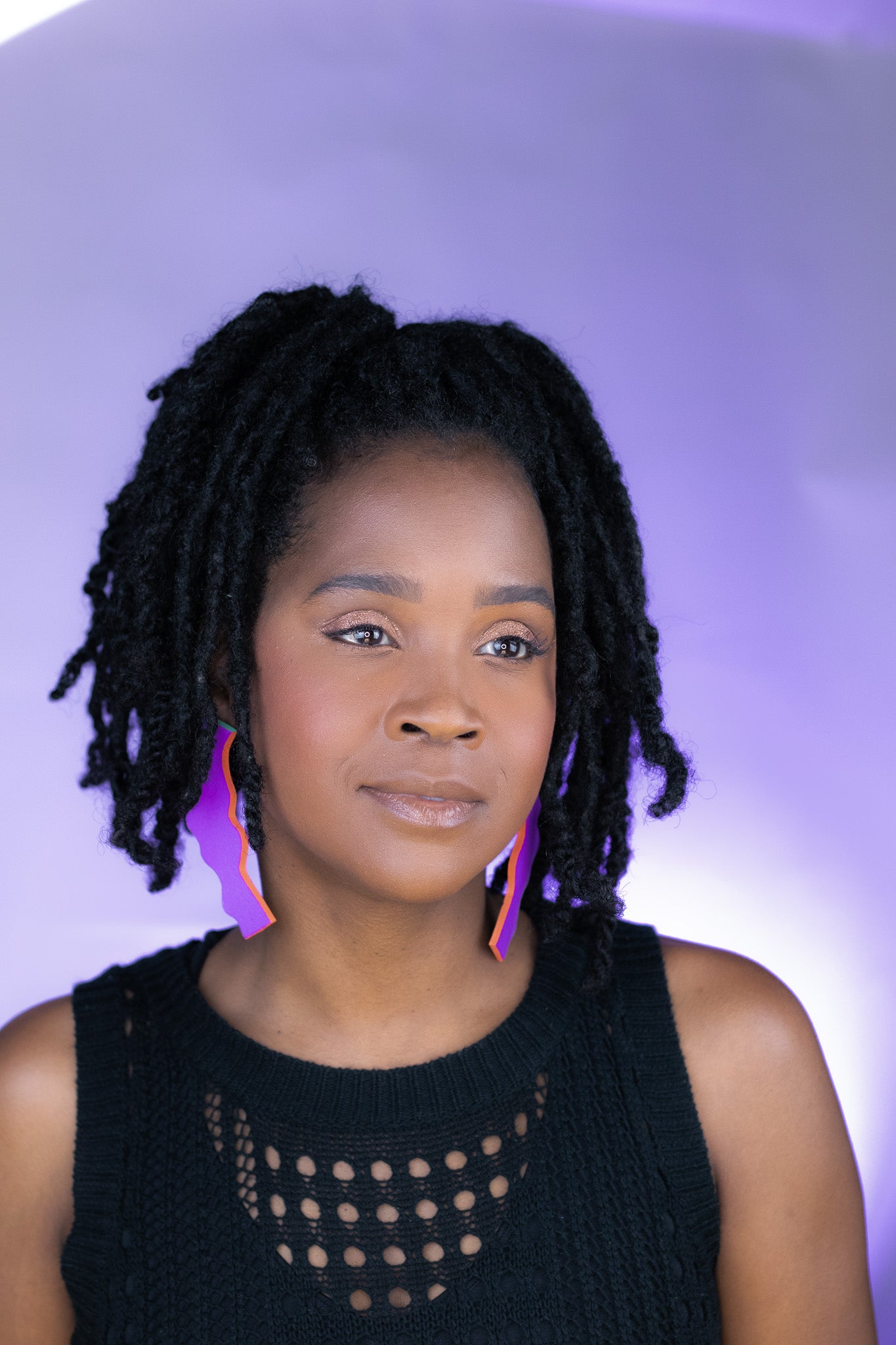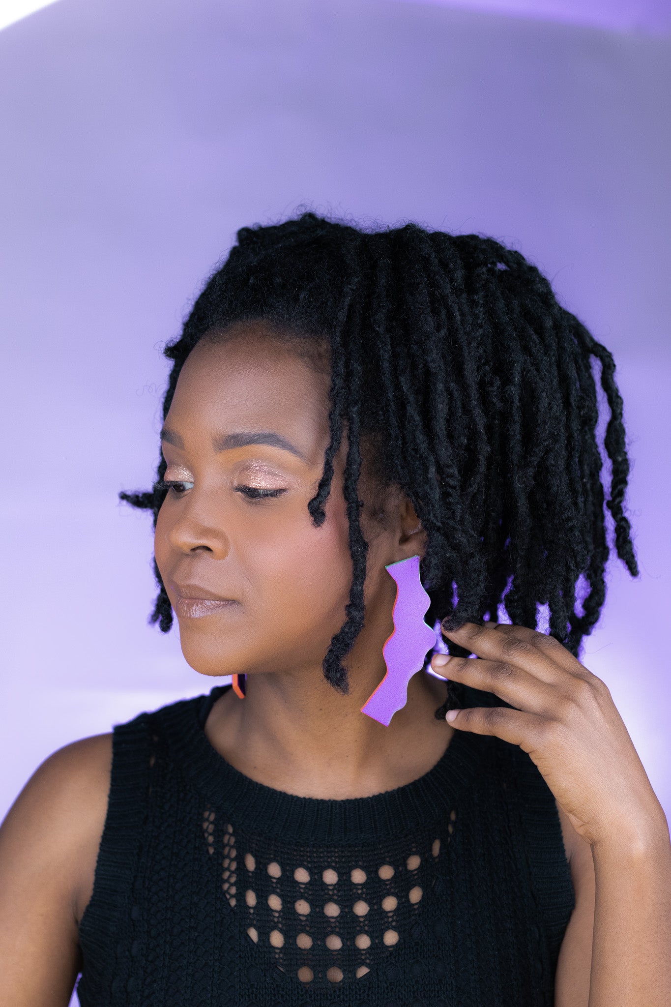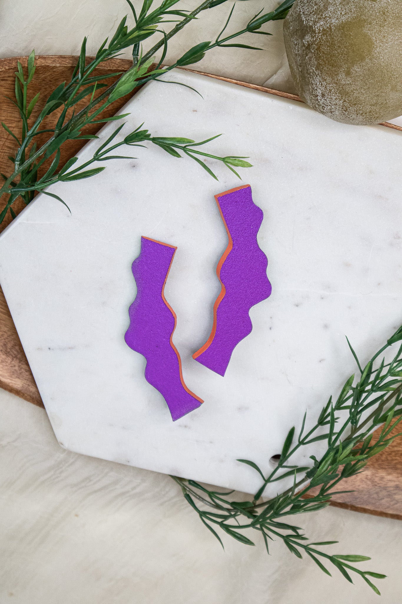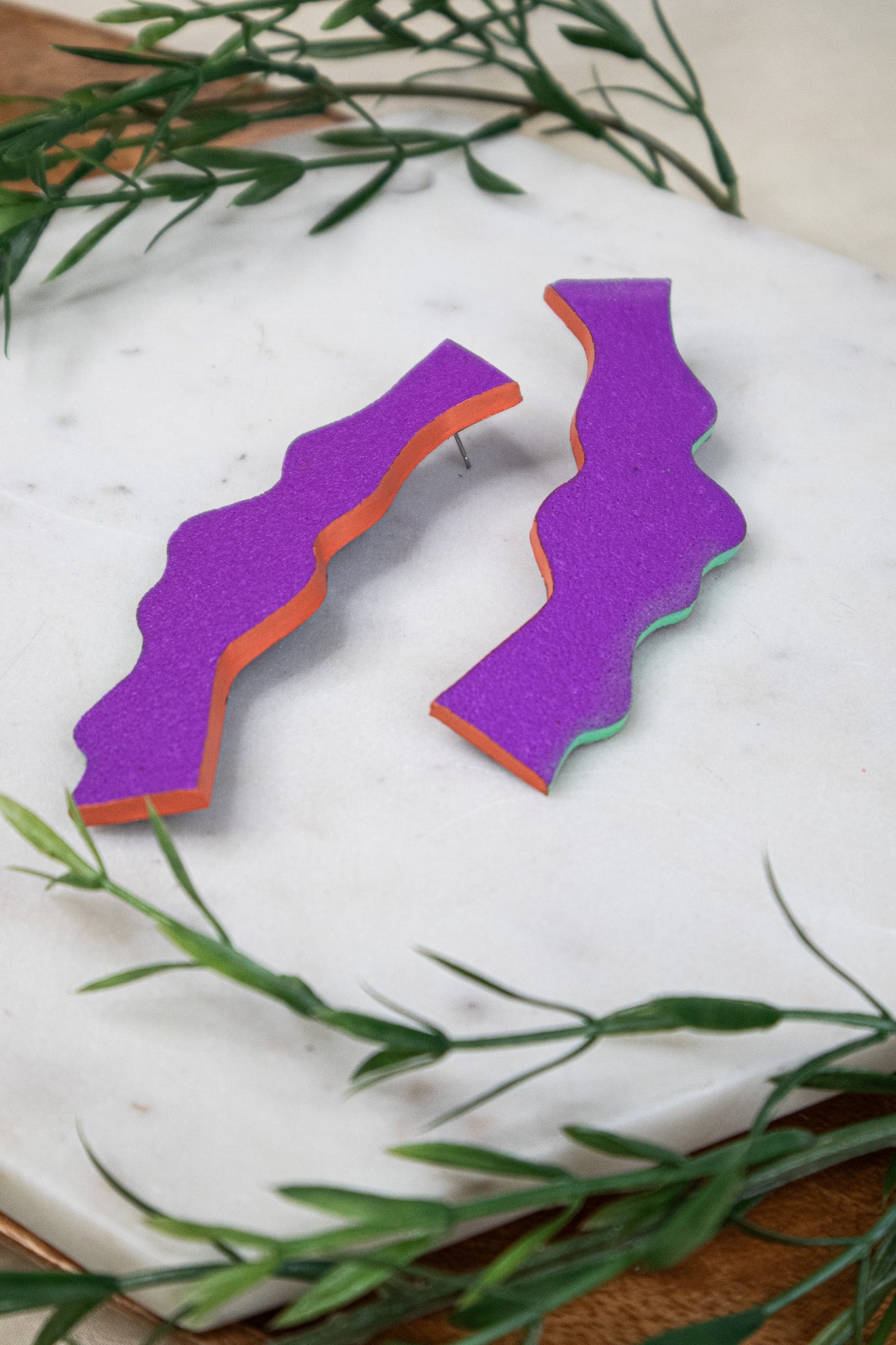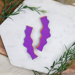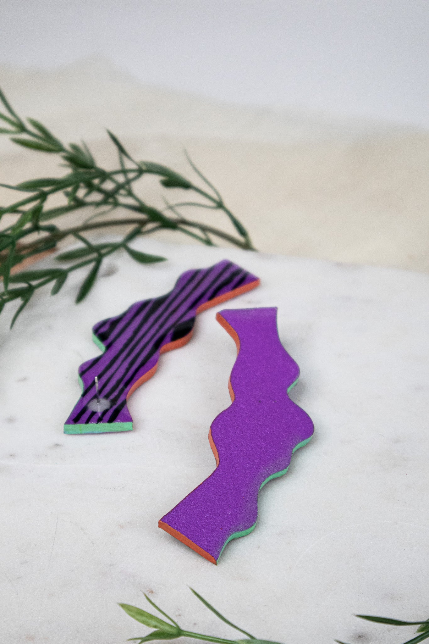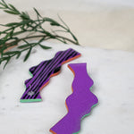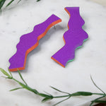 Crafted from textured clay with stainless steel posts, these earrings are ultra-light for all-day wear and big style without the pull. A rich purple with a punchy personality. Violet Wiggle features a vivid matte violet front, with graphic black stripes on a neon green and orange base on the back. Colorful and playful in all the right ways.