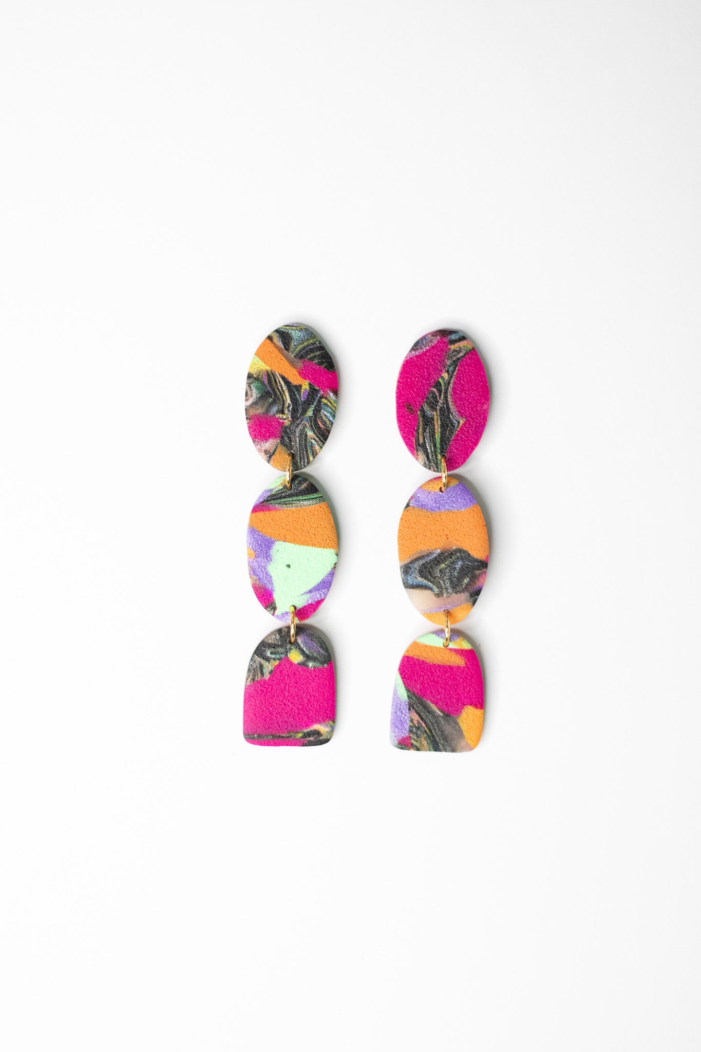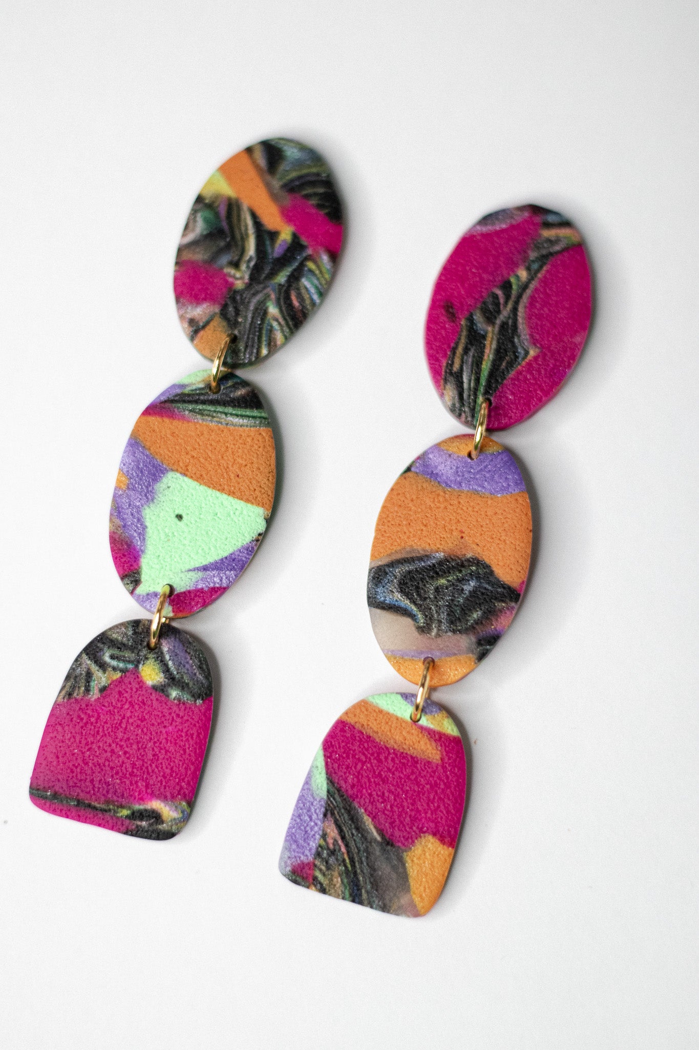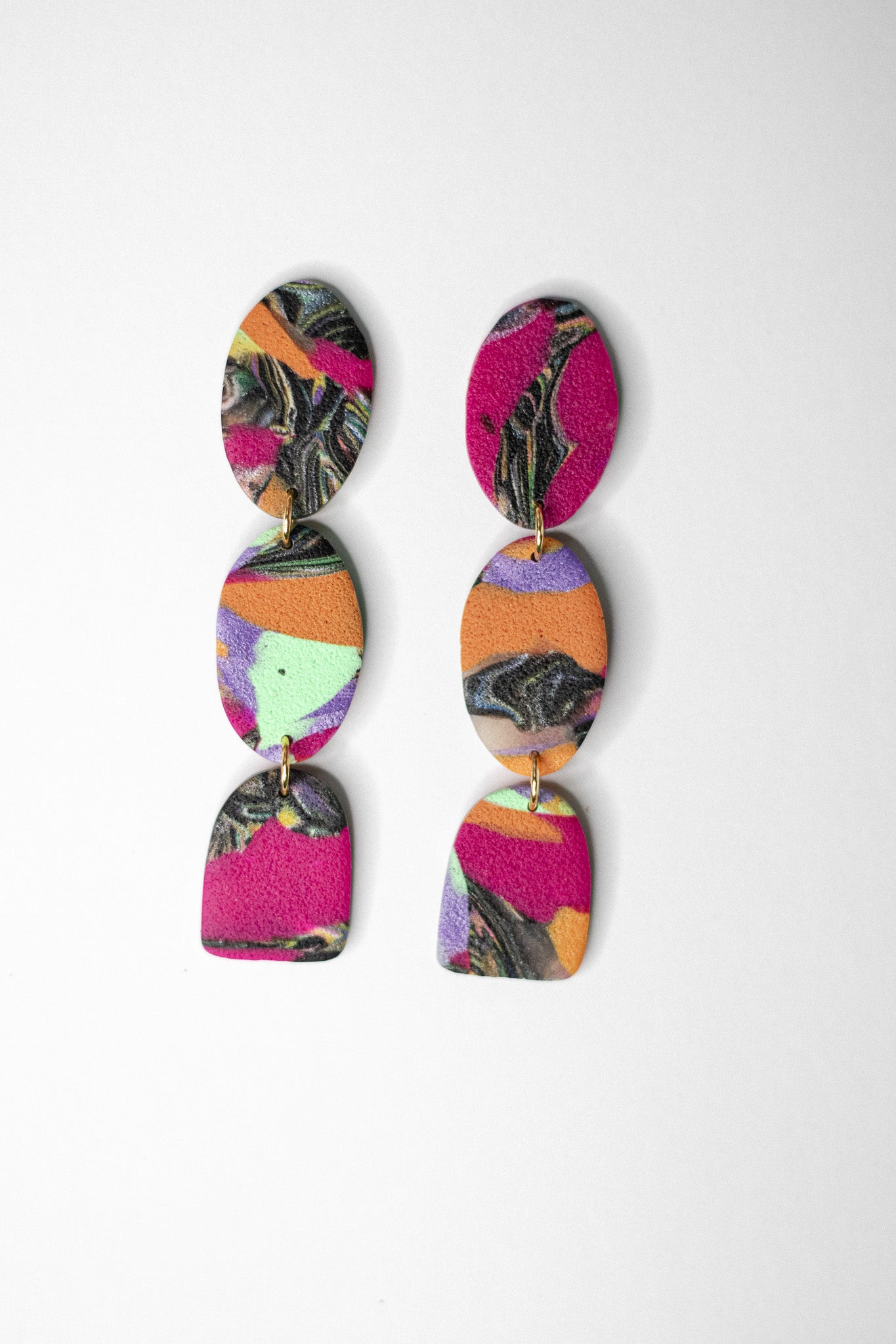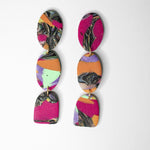 These elegant drop earrings capture the spirited vibe of a road trip playlist in a wearable form. Featuring layered polymer clay with vivid prints, they complement a variety of styles effortlessly. Designed to be lightweight and dynamic, they bring graceful movement to any ensemble.
