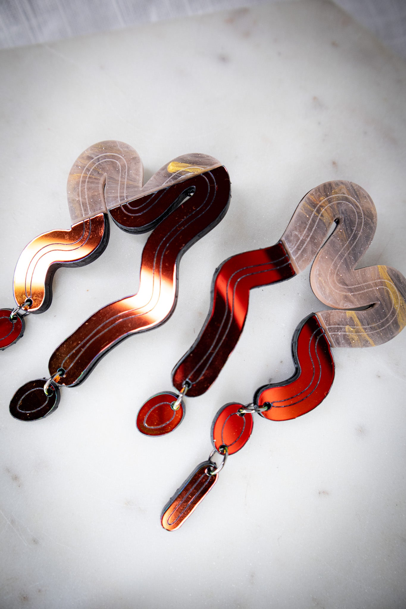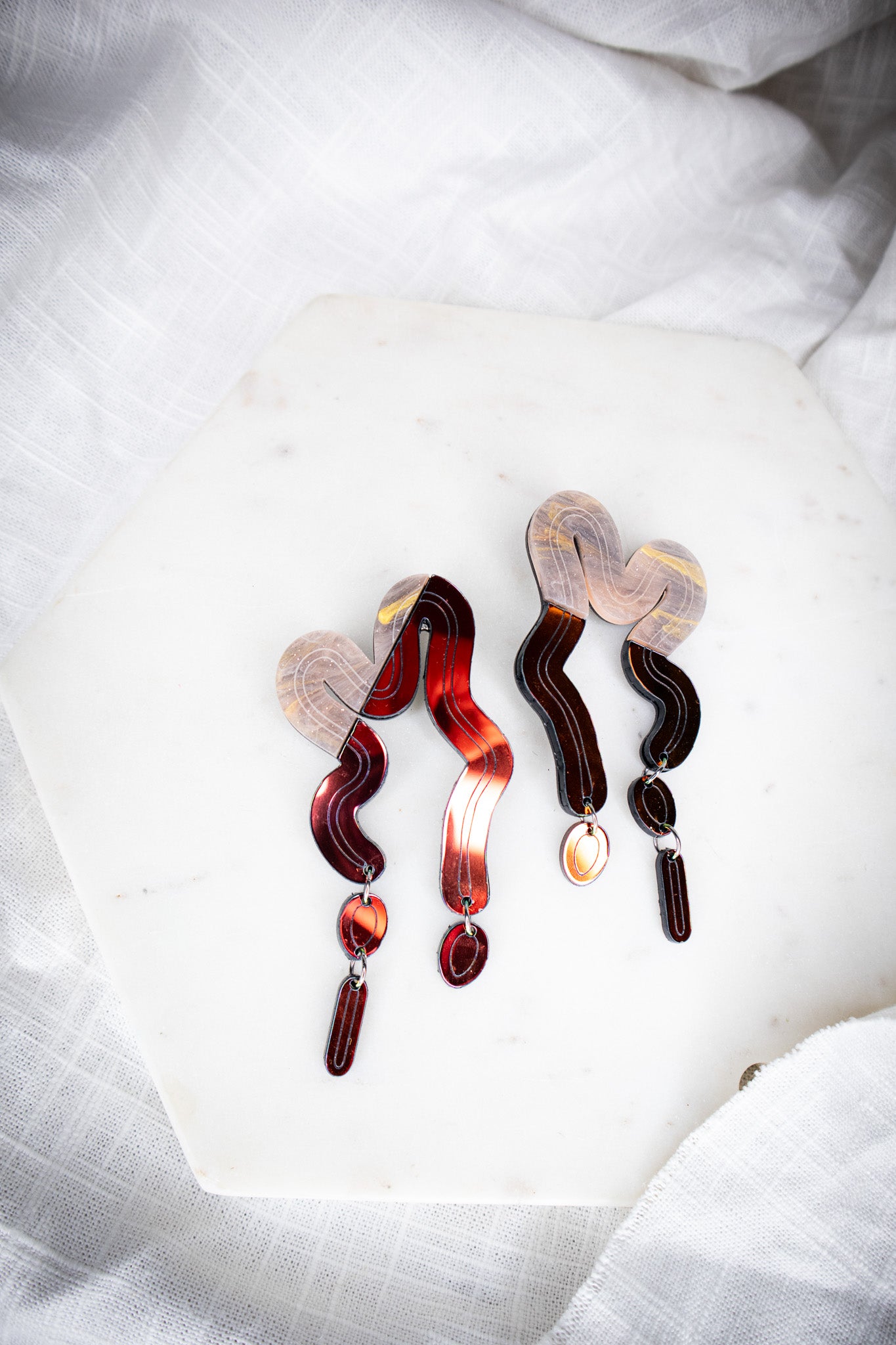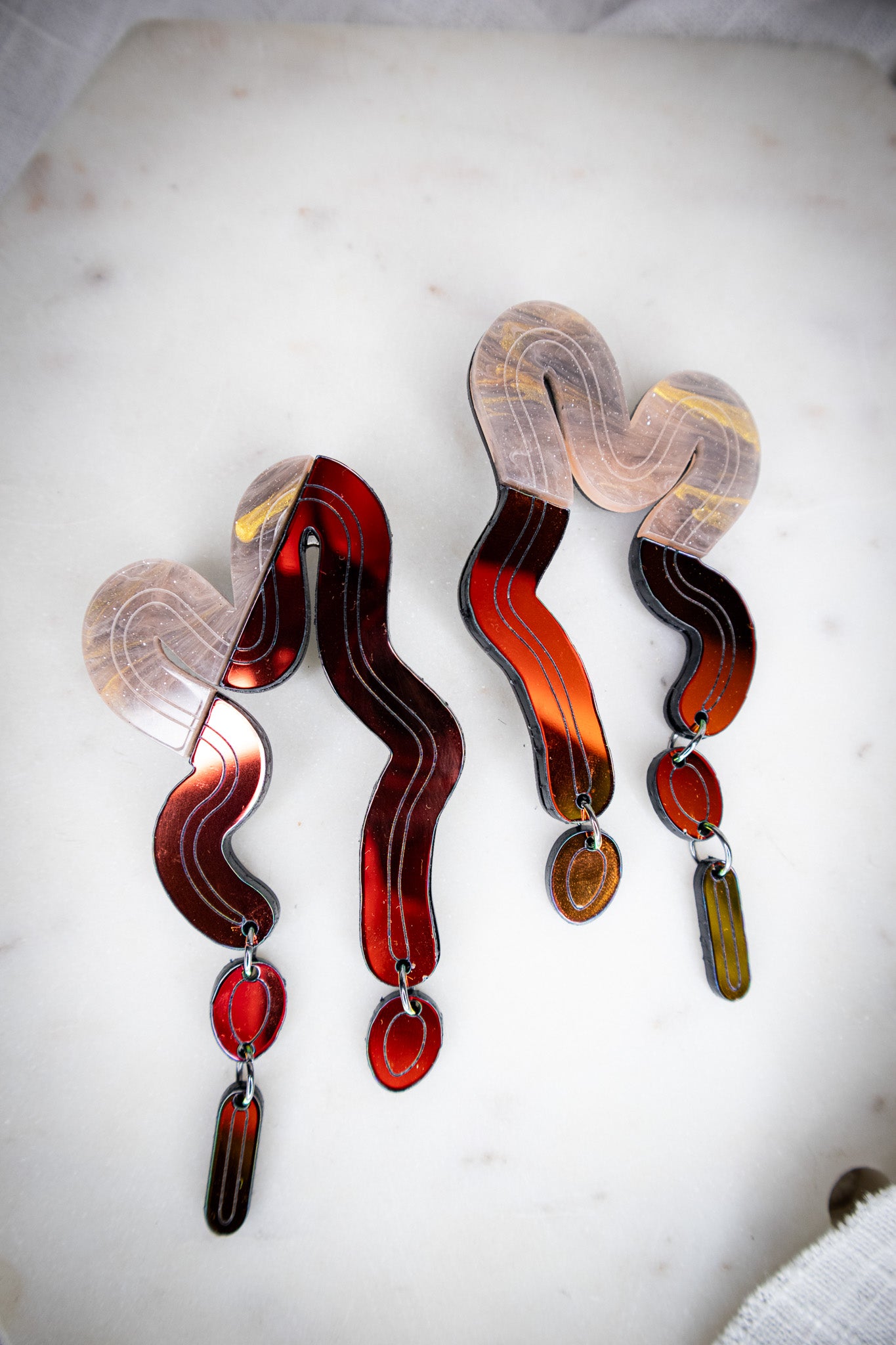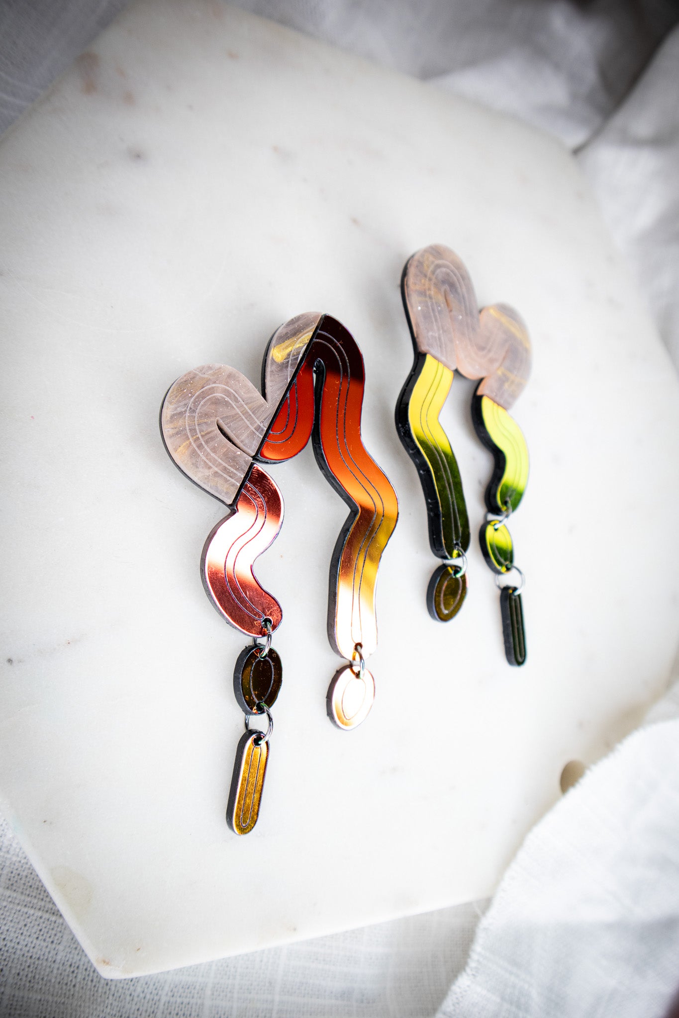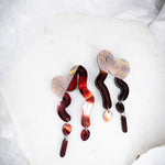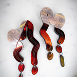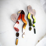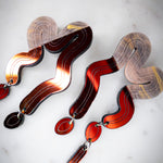 This blend of marbled orange and fiery midnight iridescent brings warmth and rhythm to every curve. Inspired by molten lava and desert tones, the Split Vyne Dangles dance with color and movement while staying light as air.