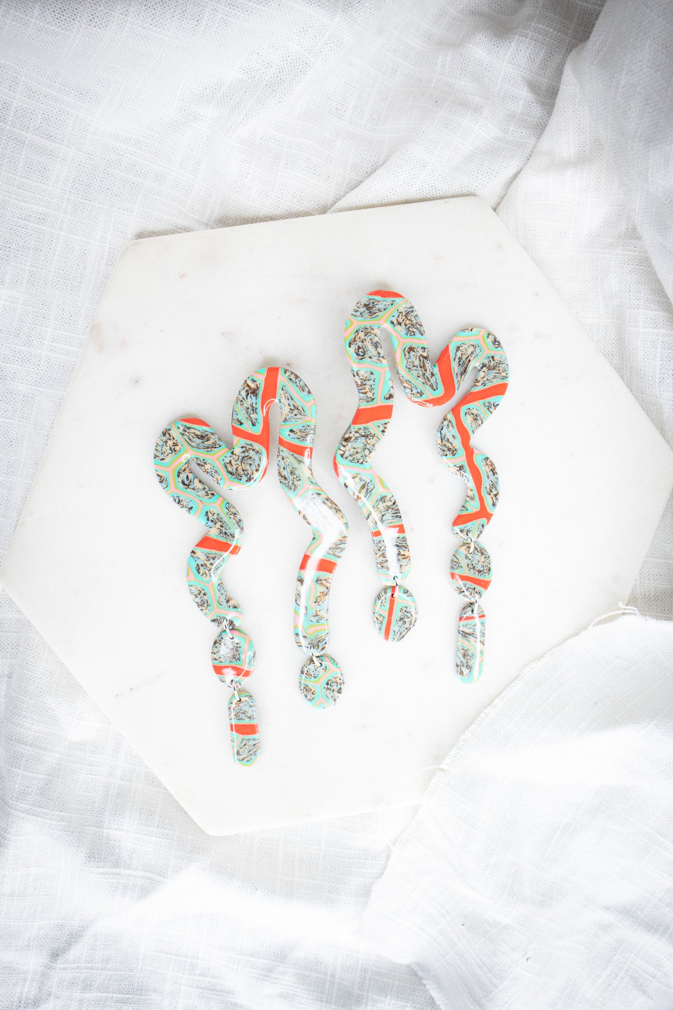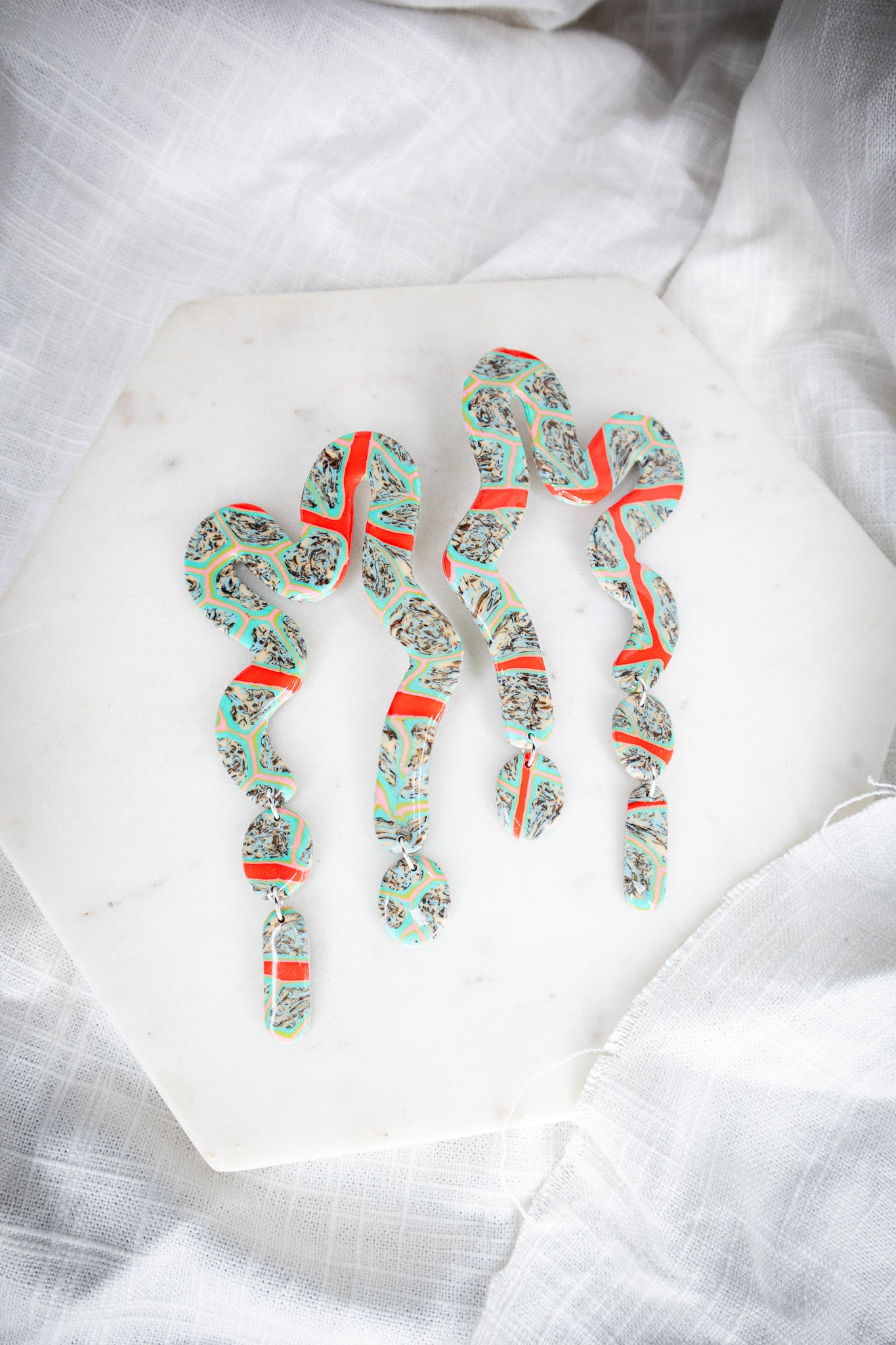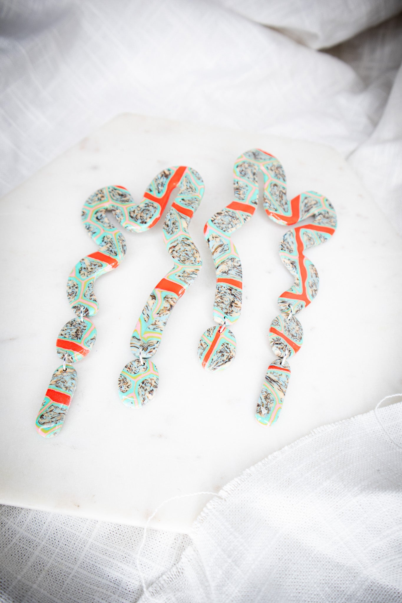 No two pairs are exactly alike. Each pattern is hand-mixed and shaped, creating wearable art that feels both grounded and expressive. Lightweight despite their length, Clay Vynes are made to sway with you—statement-making without feeling heavy.