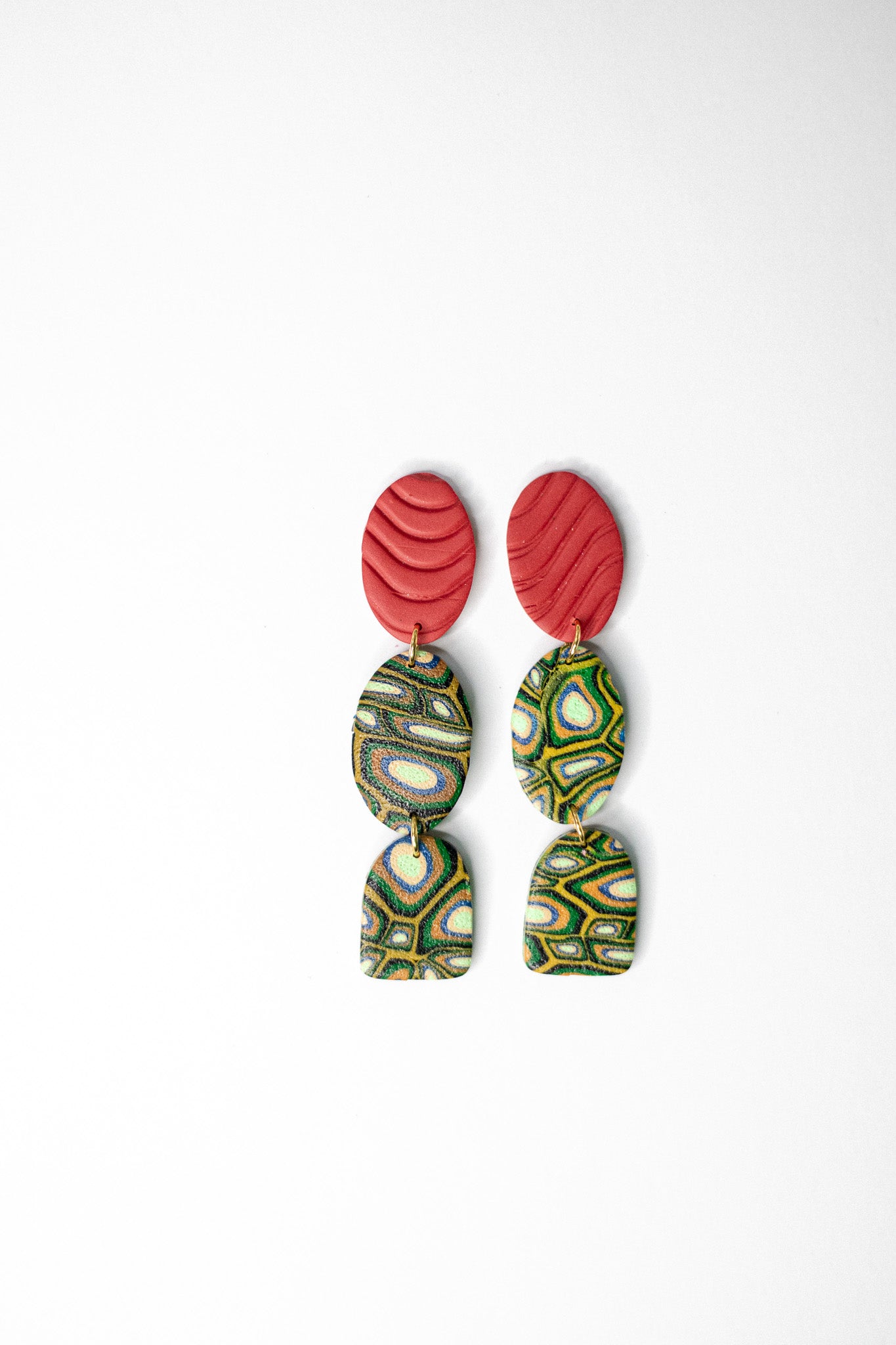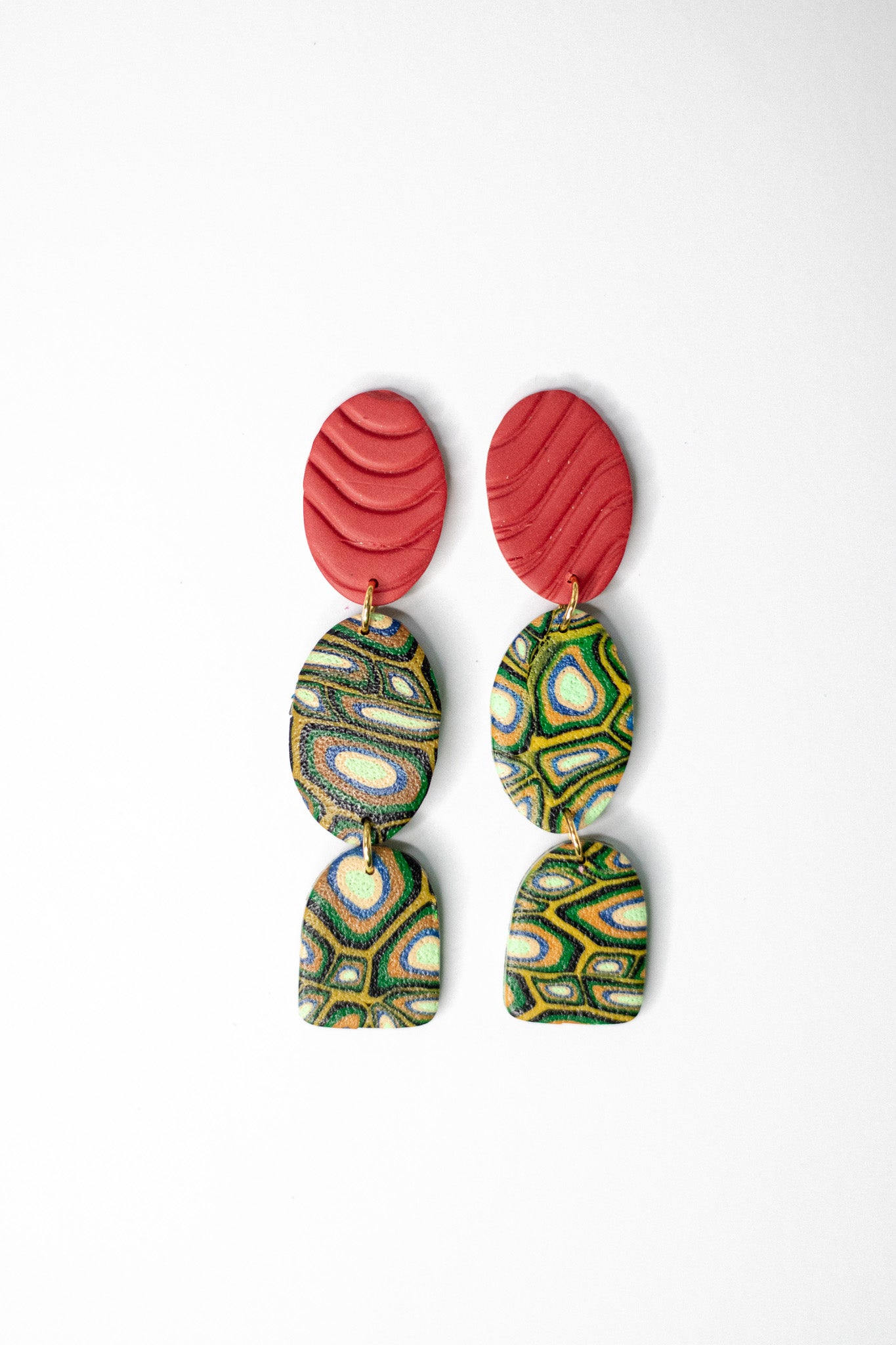 These elegant drop earrings capture the spirited vibe of a road trip playlist in a wearable form. Featuring layered polymer clay with vivid prints, they complement a variety of styles effortlessly. Designed to be lightweight and dynamic, they bring graceful movement to any ensemble.