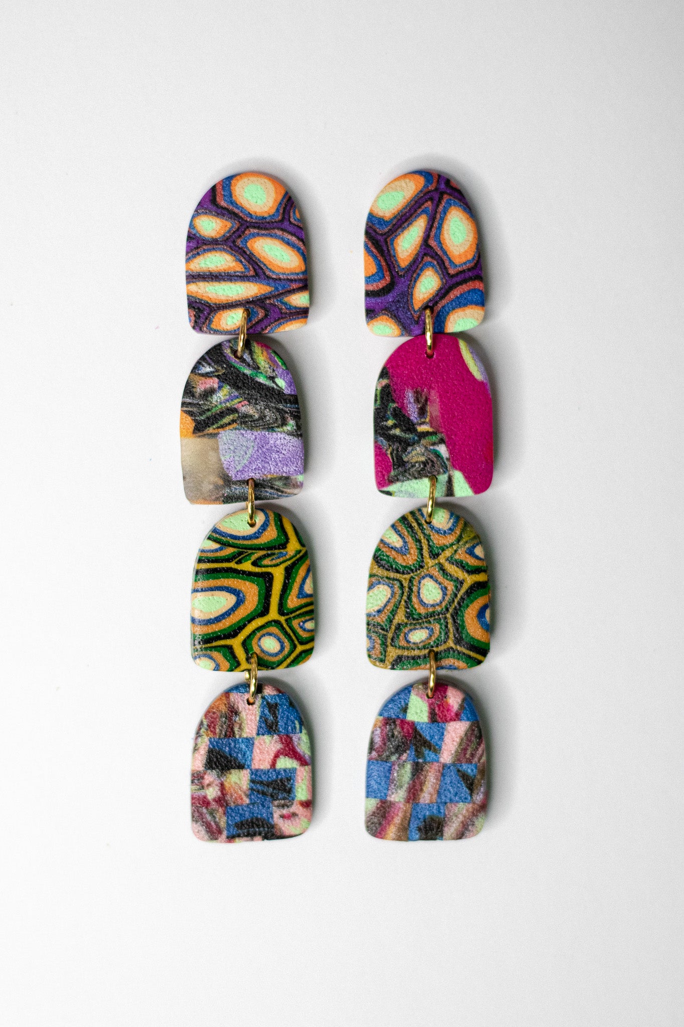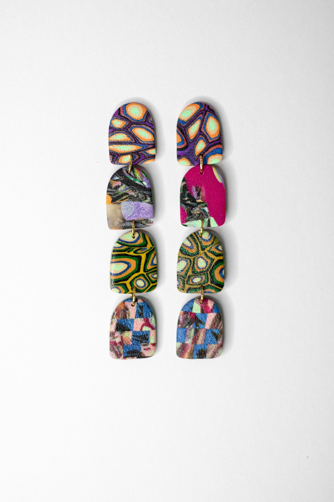 These elegant drop earrings capture the spirited vibe of a road trip playlist in a wearable form. Featuring layered polymer clay with vivid prints, they complement a variety of styles effortlessly. Designed to be lightweight and dynamic, they bring graceful movement to any ensemble.