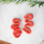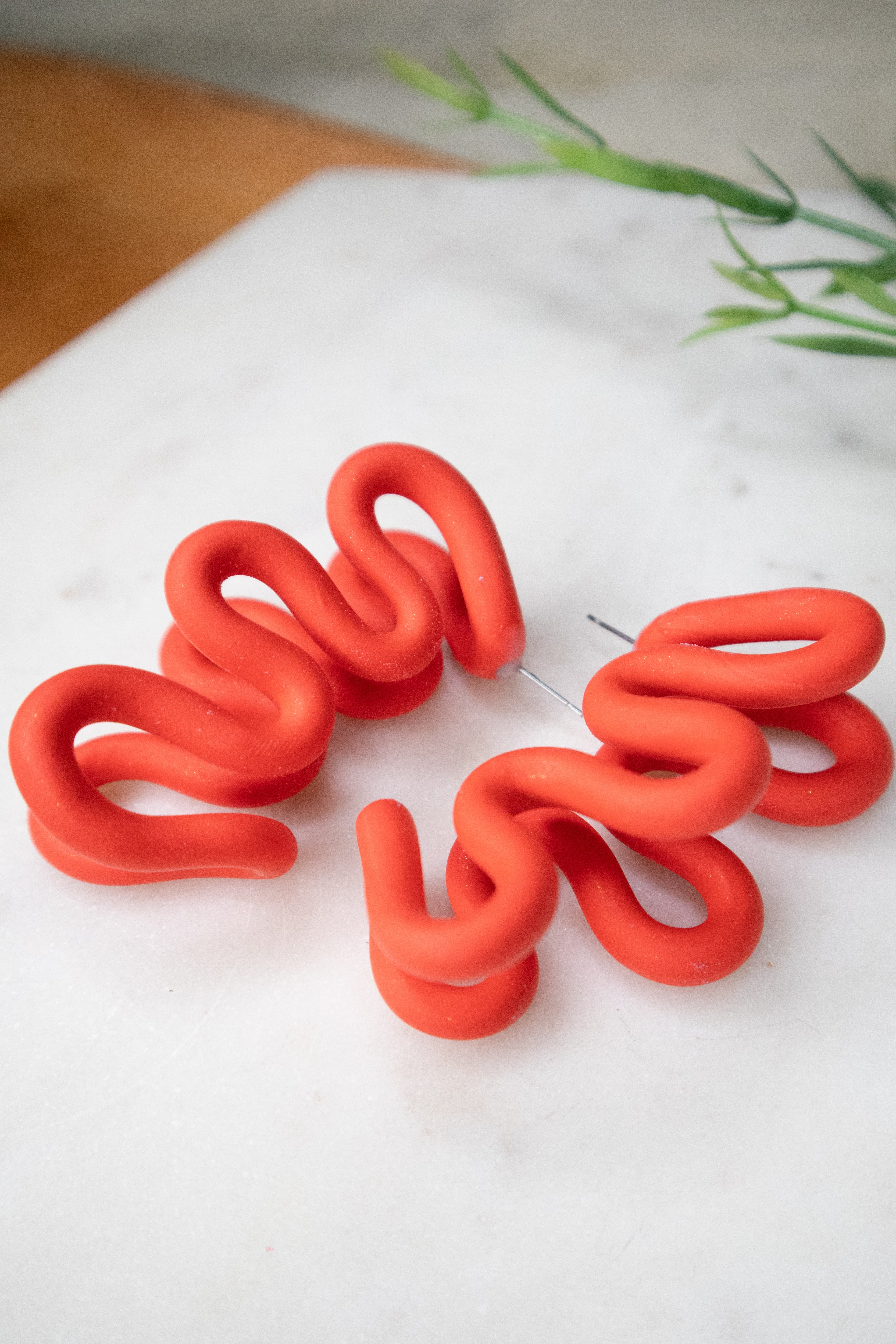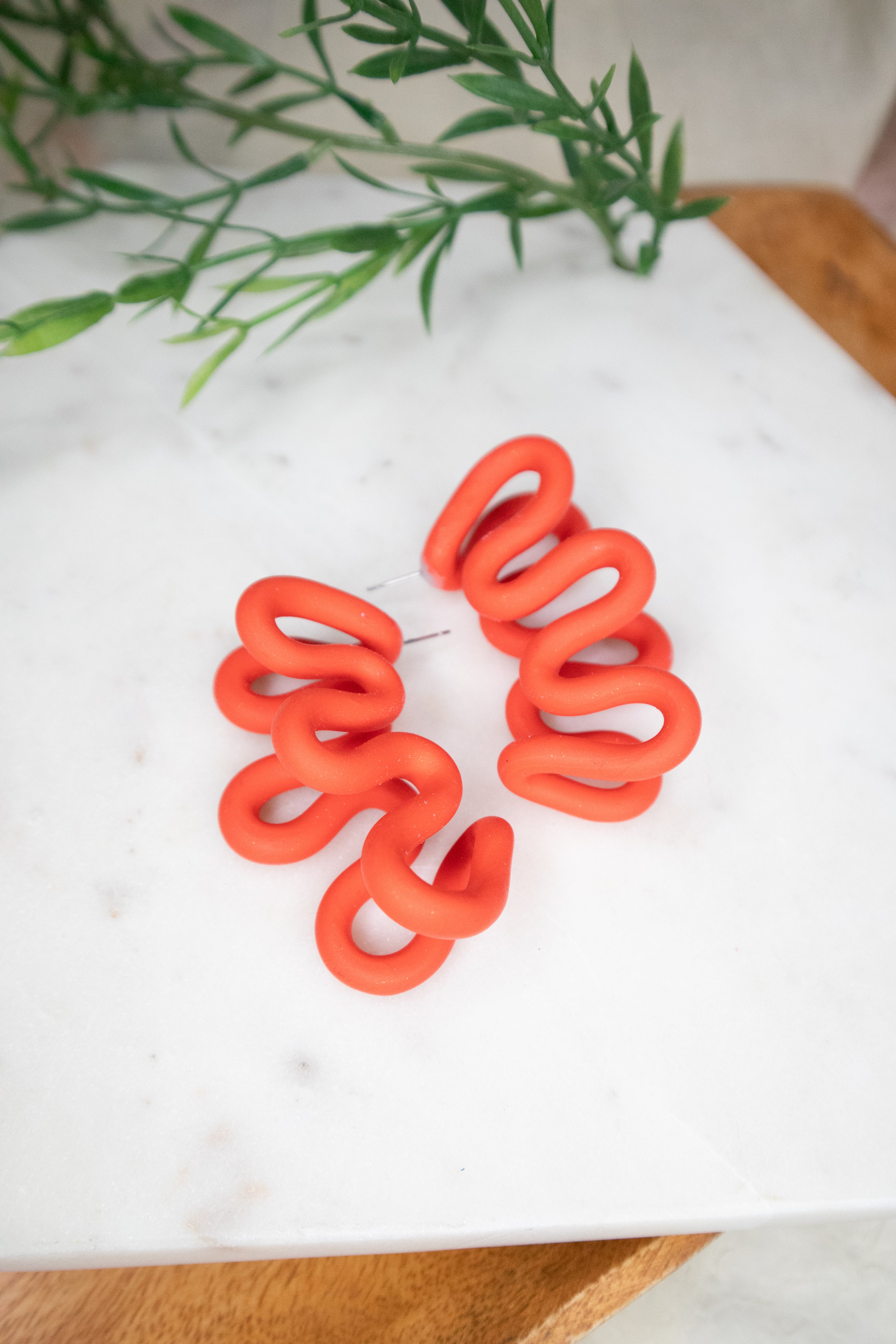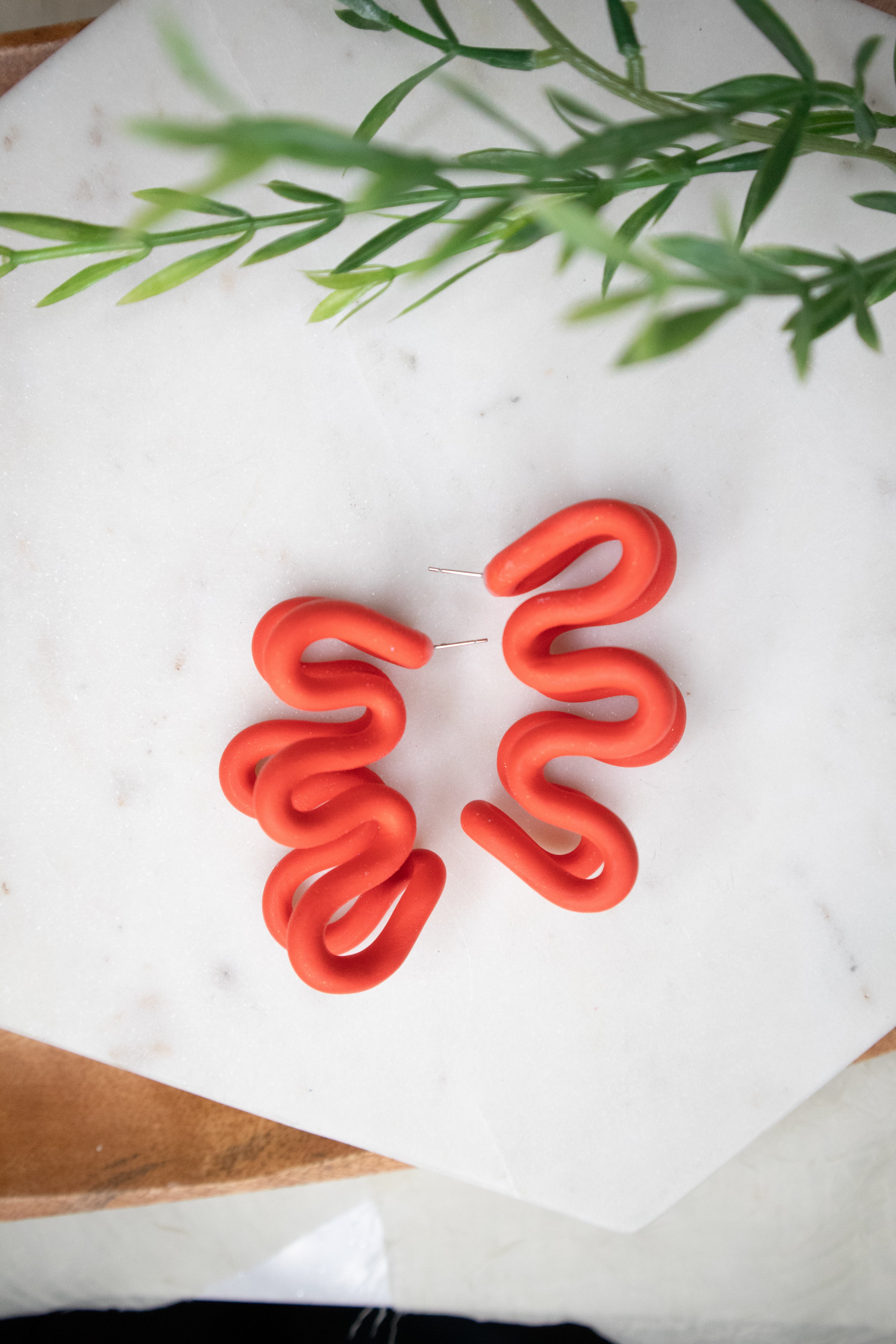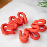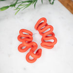 Turn heads in Flame Red, a vibrant, fire-engine hue that feels equal parts fierce and fun. A color for risk-takers and outfit-makers. Playful, bold, and full of personality. The Plumeria Bloom Mini Earrings are handcrafted hoops featuring oversized sculptural squiggles inspired by the organic shape of plumeria petals in bloom. Their lightweight feel and dramatic silhouette make them perfect for turning everyday outfits into bold statements.