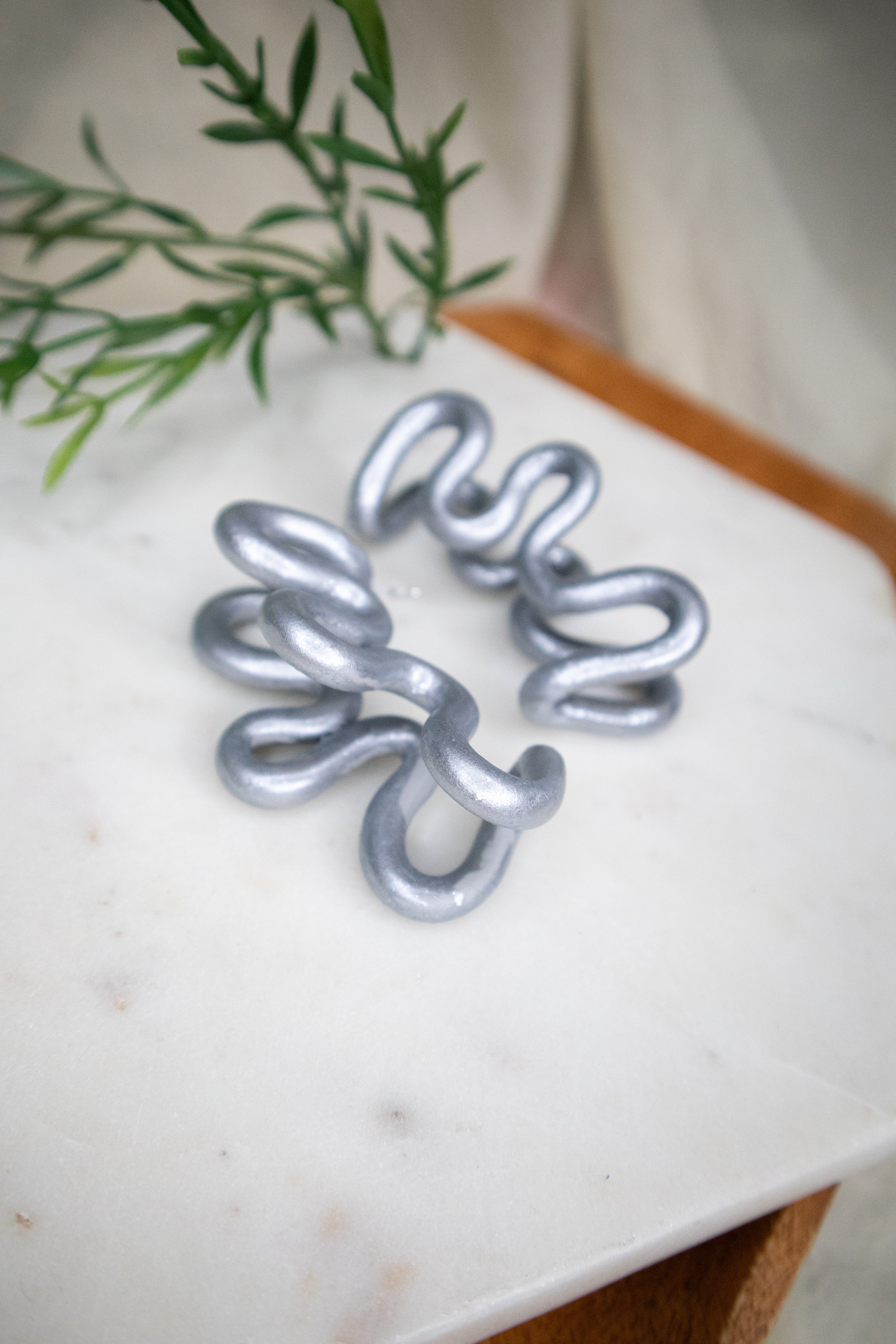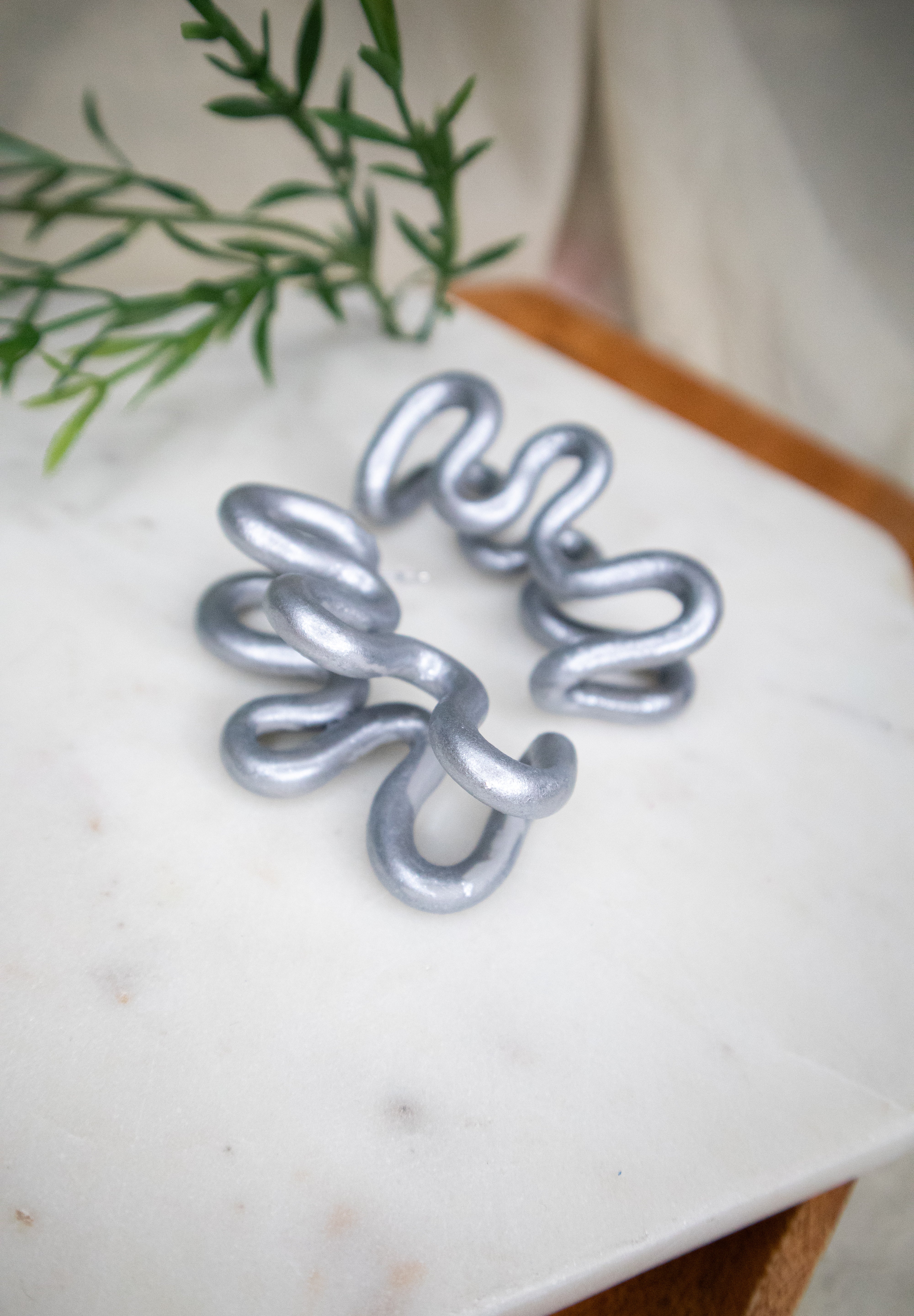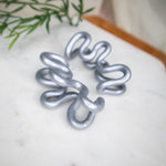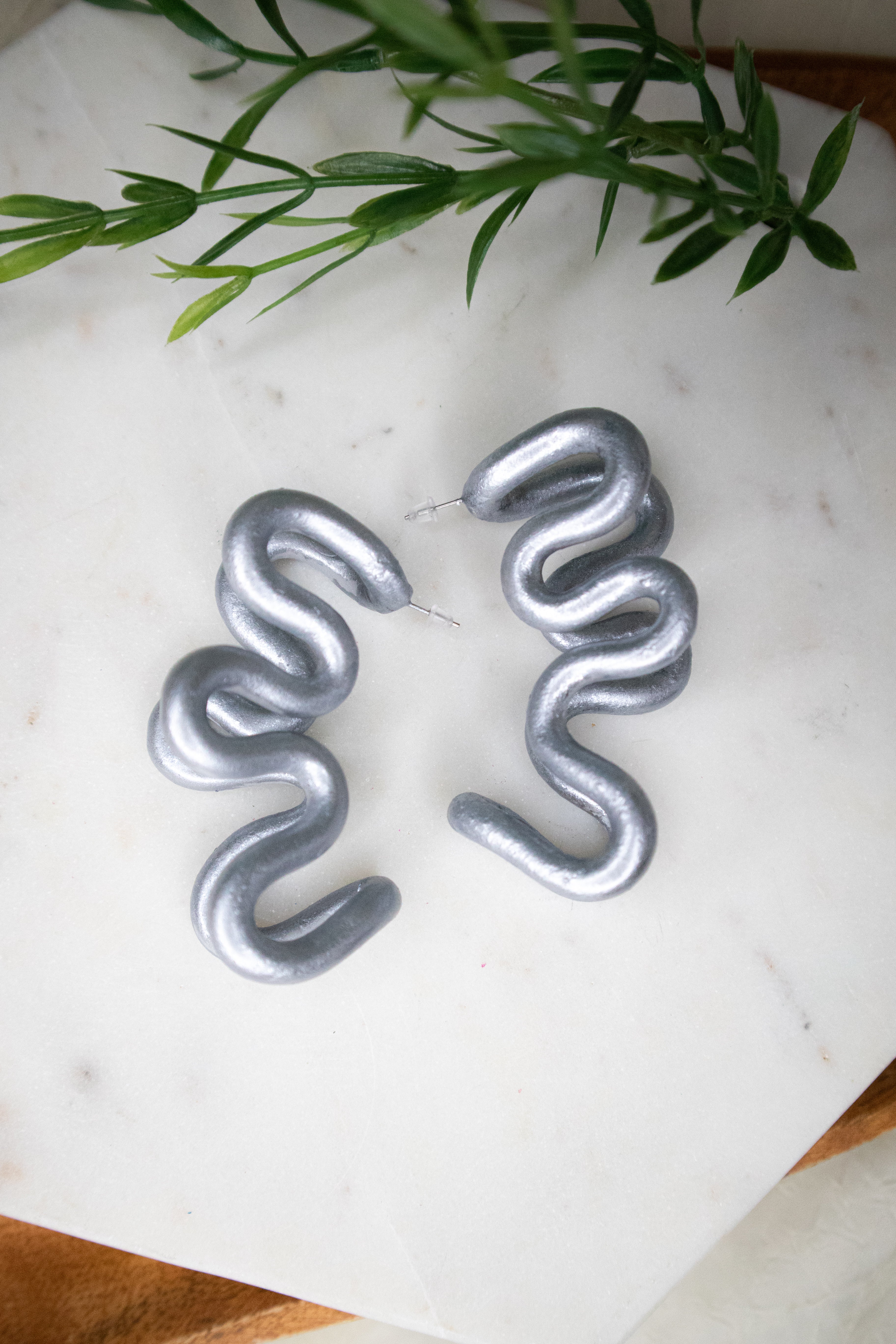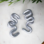 Shimmer in Silver Metallic—a cool silver tone with a luminous finish. It’s a bold-yet-classic colorway that gives you an elevated shine without the weight of metal. Playful, bold, and full of personality. The Plumeria Bloom Earrings are handcrafted hoops featuring oversized sculptural squiggles inspired by the organic shape of plumeria petals in bloom. Their lightweight feel and dramatic silhouette make them perfect for turning everyday outfits into bold statements.