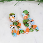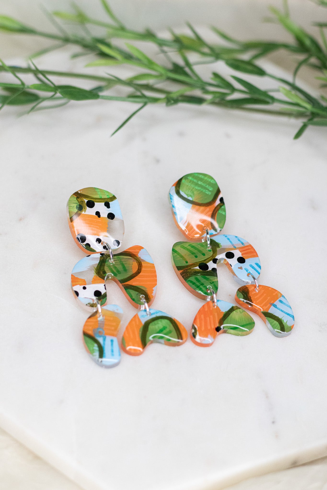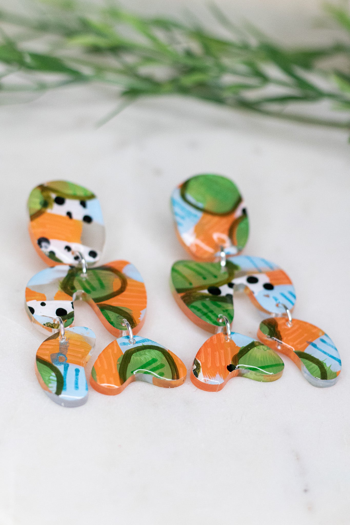 Like sculpture in motion. With abstract organic shapes linked together, these earrings in purple and orange feel like a 90s art class dream. Lightweight, with just the right amount of movement to catch the light.