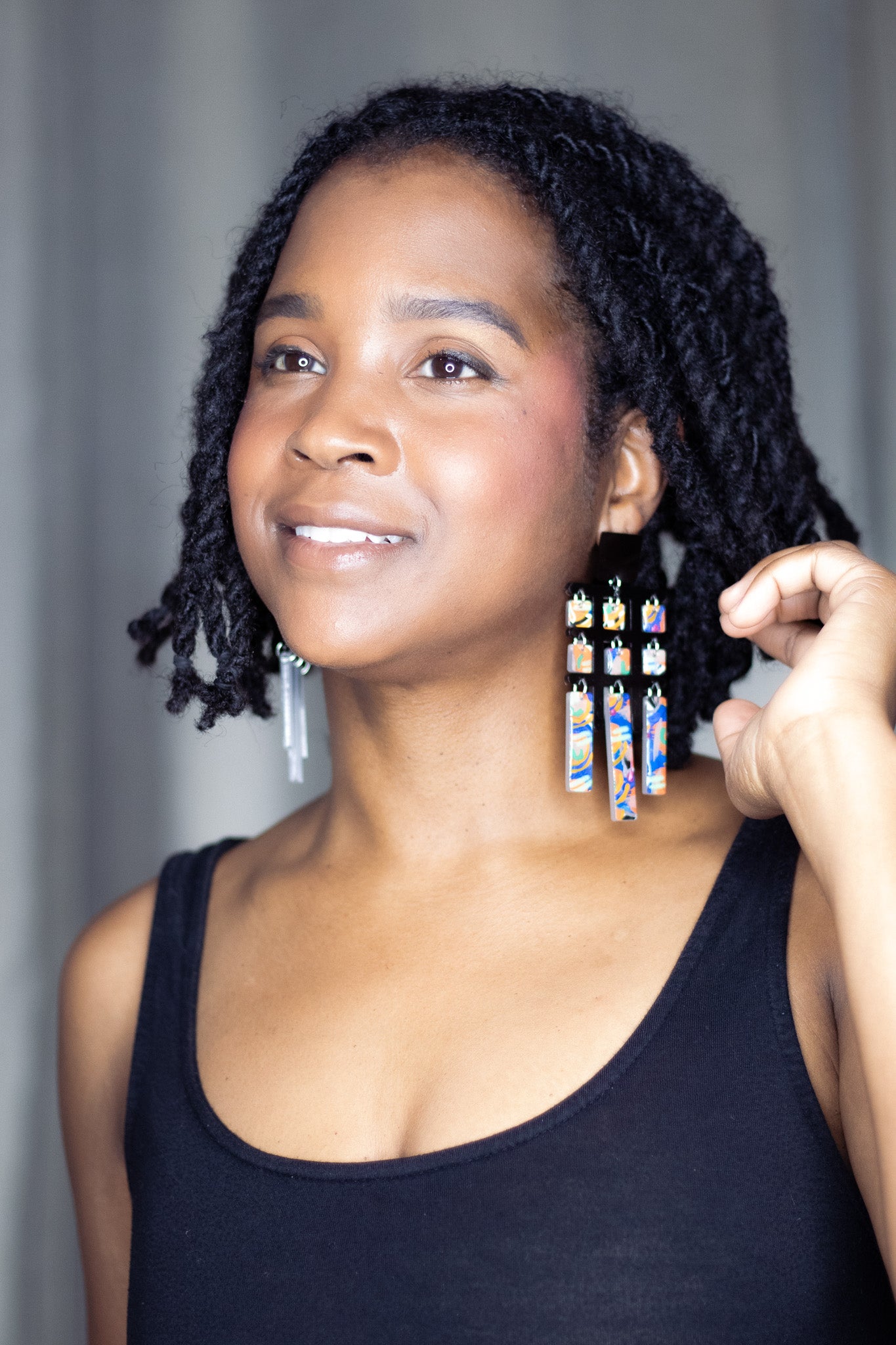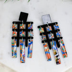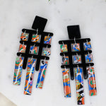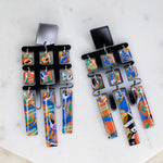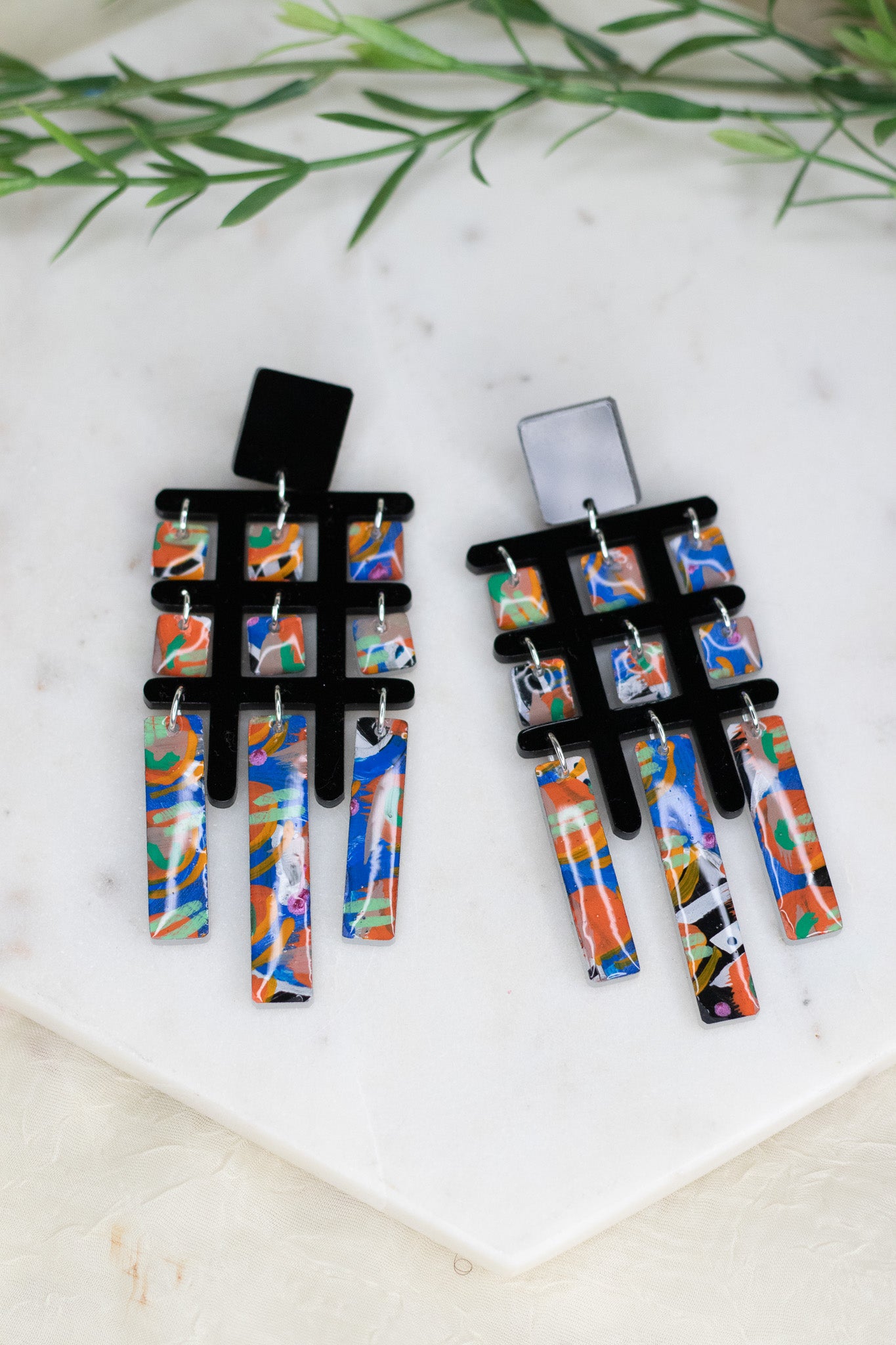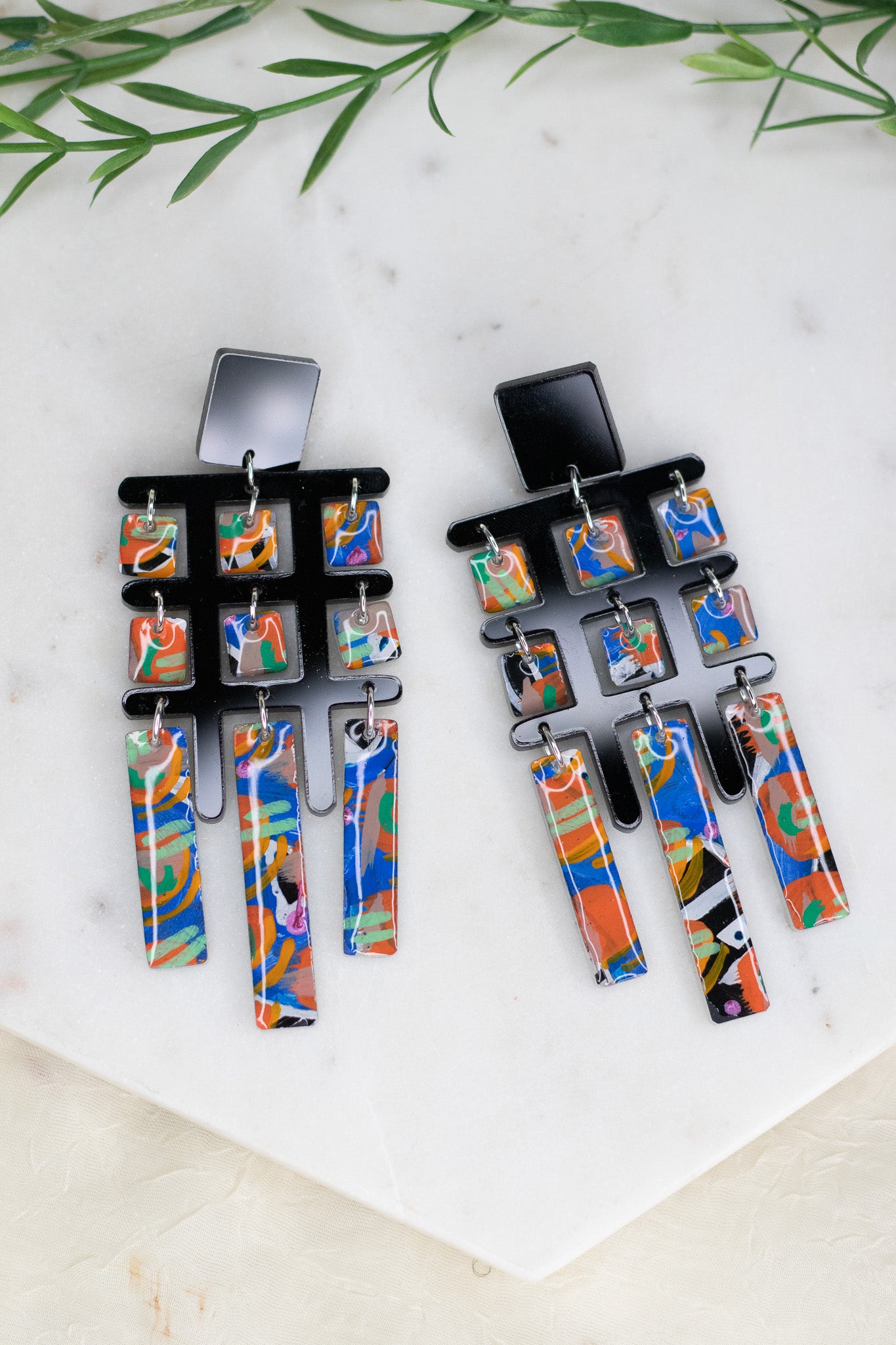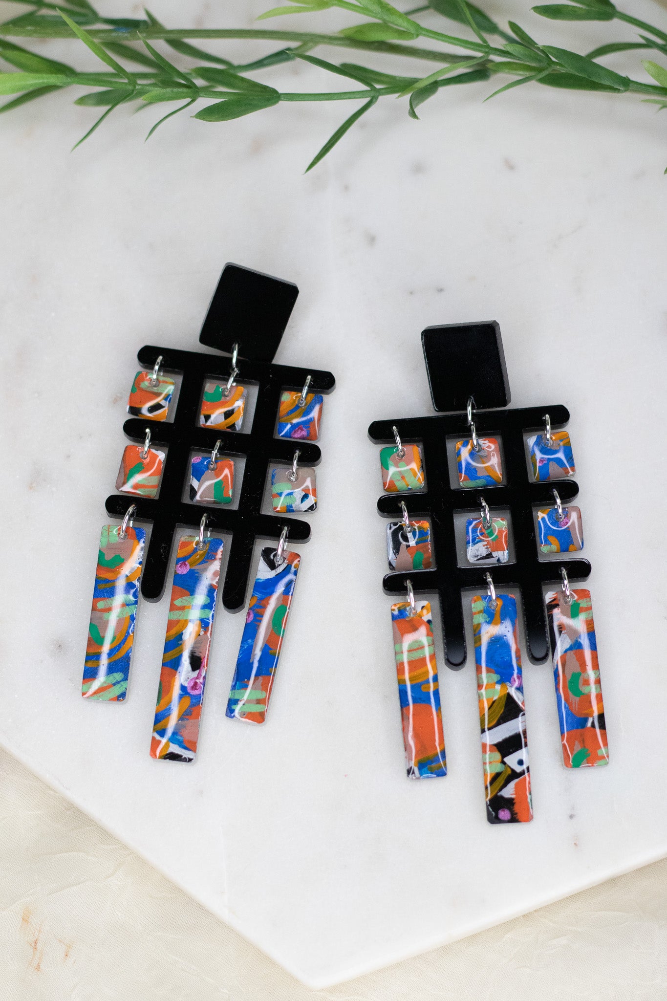 Bold. Modern. Art you can wear. These handmade Venus earrings feature a glossy black grid base adorned with vivid abstract patterns in red, blue, green, and orange. Each dangling tile feels like a miniature canvas, perfect for those who treat fashion like art.