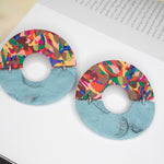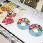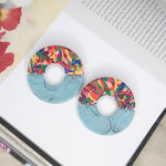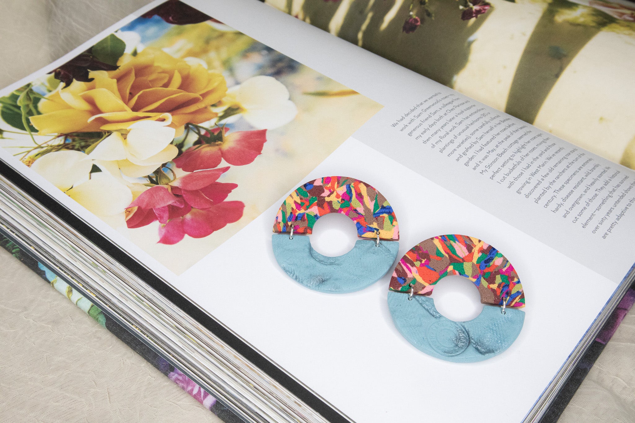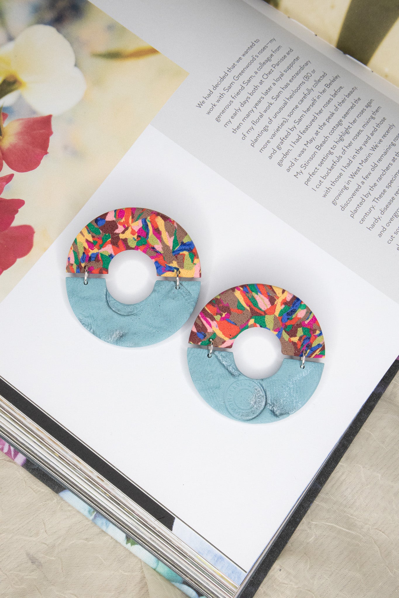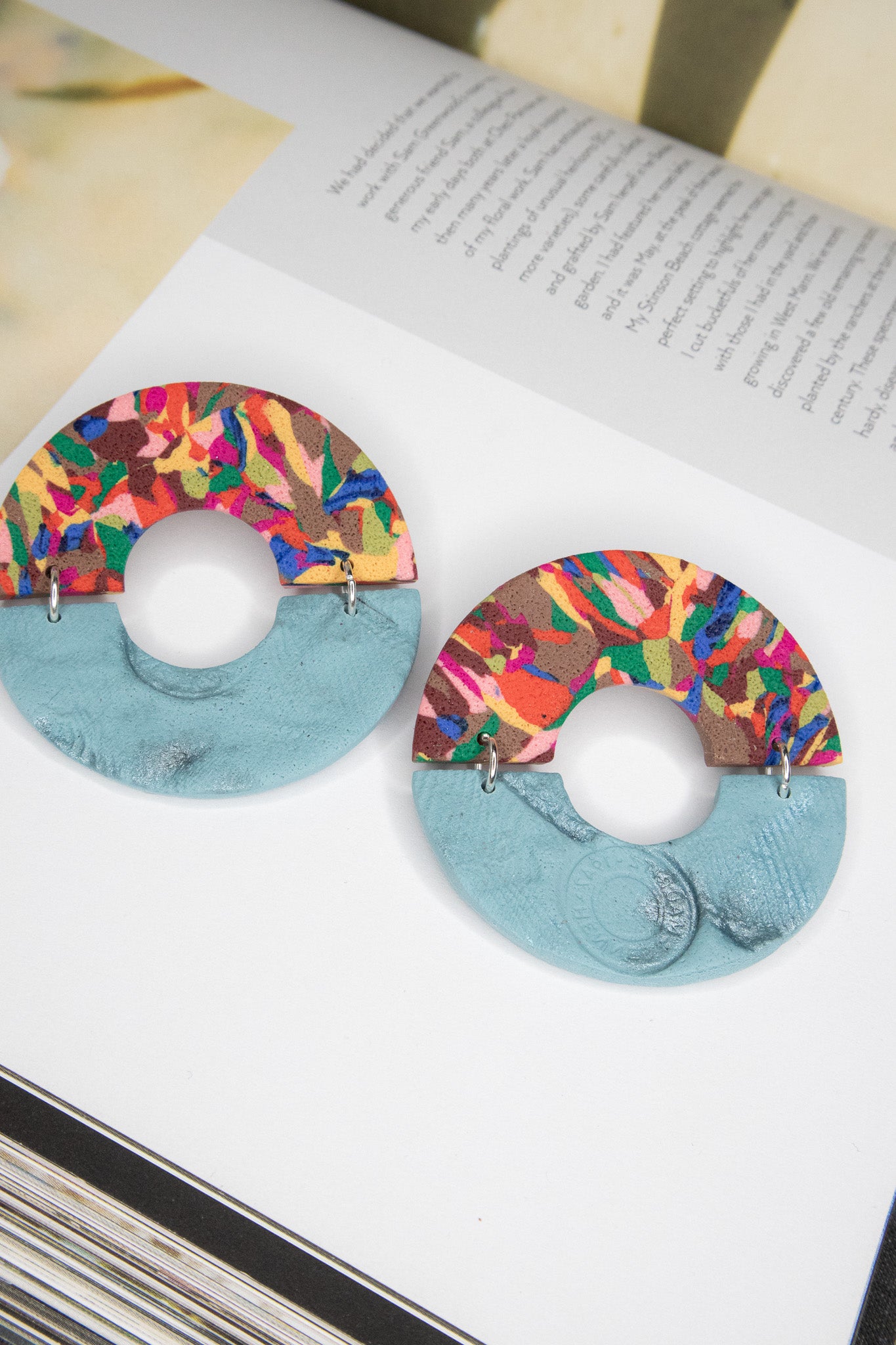 A joyful blend of color and calm. Waterlily with open Circle in Denim Mosaic pairs a kaleidoscope of vibrant clay shards with a soft blue lower curve, creating a balanced, sculptural shape that moves beautifully. These earrings feel playful yet grounded — like creativity with intention.